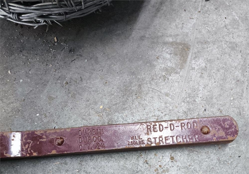 (2) Barbed Wire and a Fence Stretcher Tool. The fence stretcher is identified as a "Red-D-Rod Stretcher".