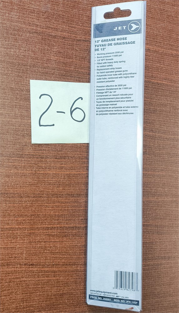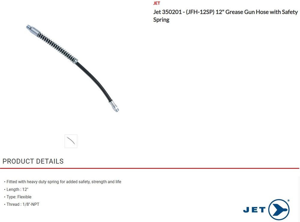 12-inch flexible grease hose, also known as a grease gun hose, from the brand JET. It is an accessory used with grease guns to apply lubricant to hard-to-reach areas.