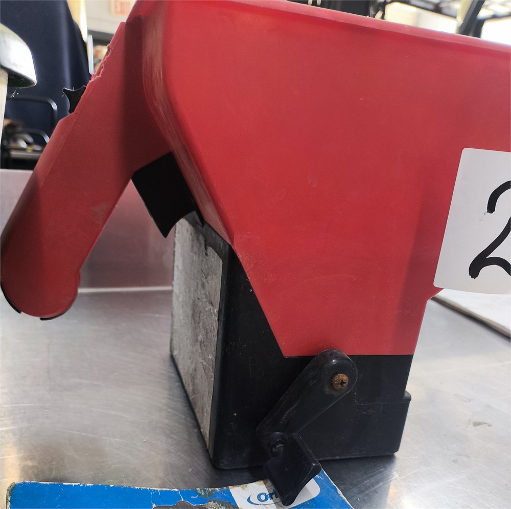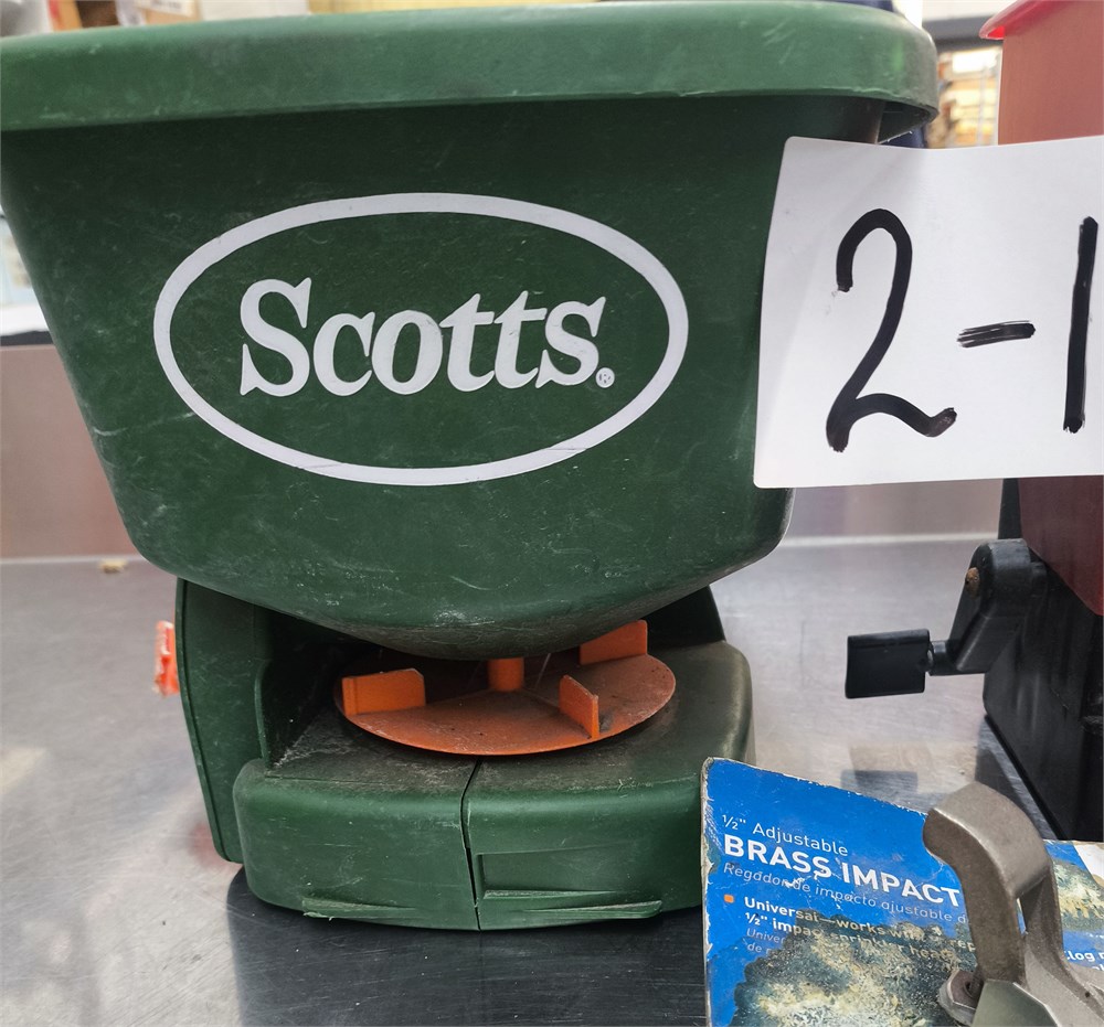 • Scotts brand spreader, which is used for distributing fertilizer, seed, or other lawn care products.