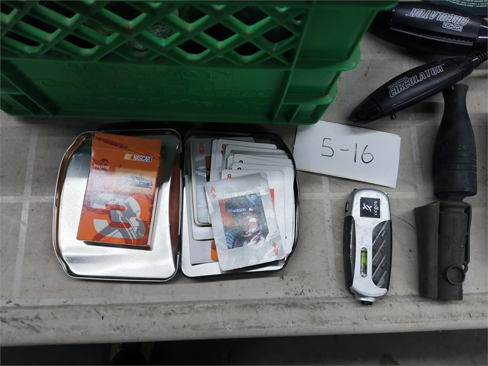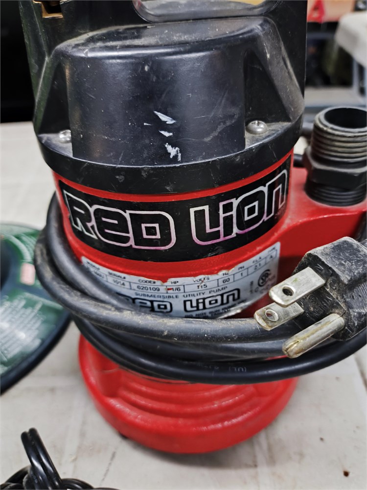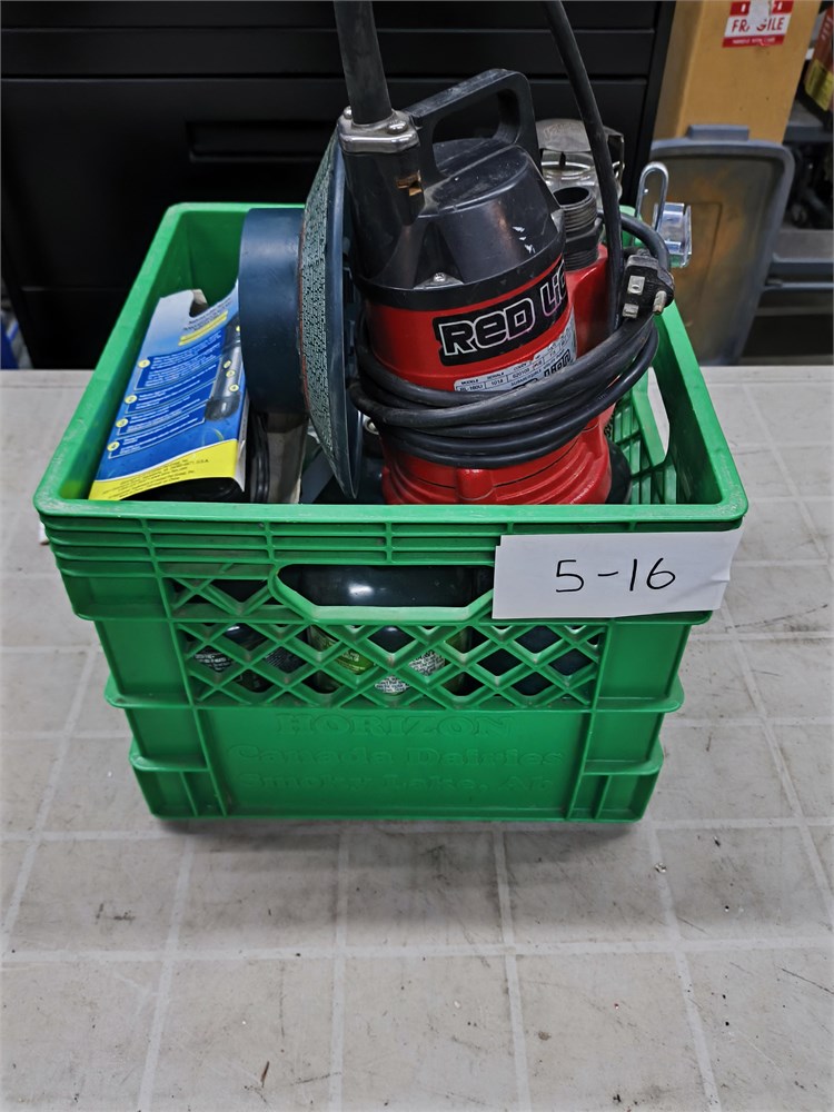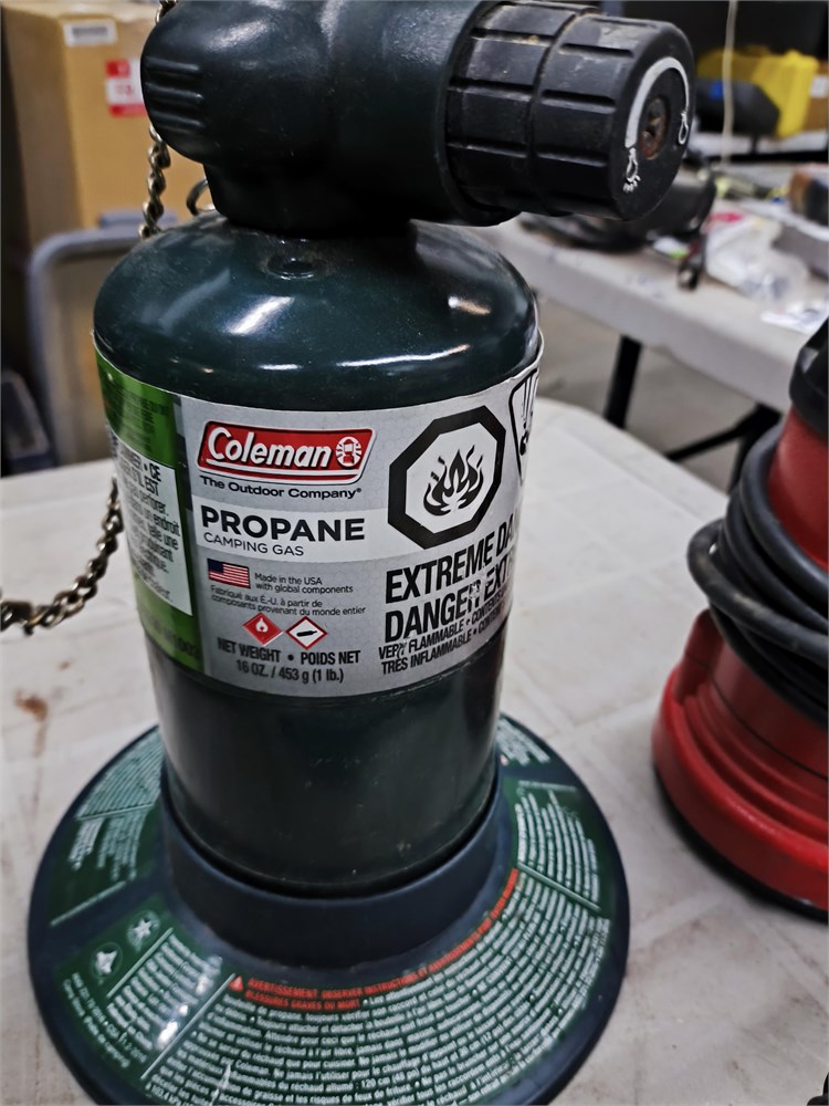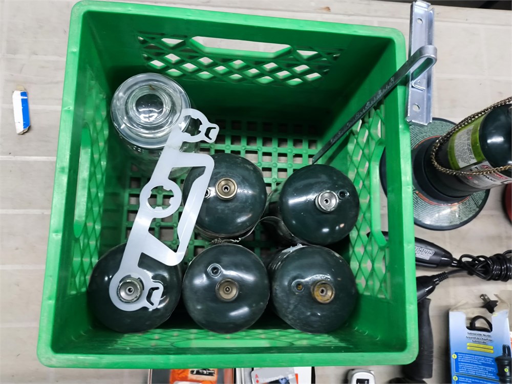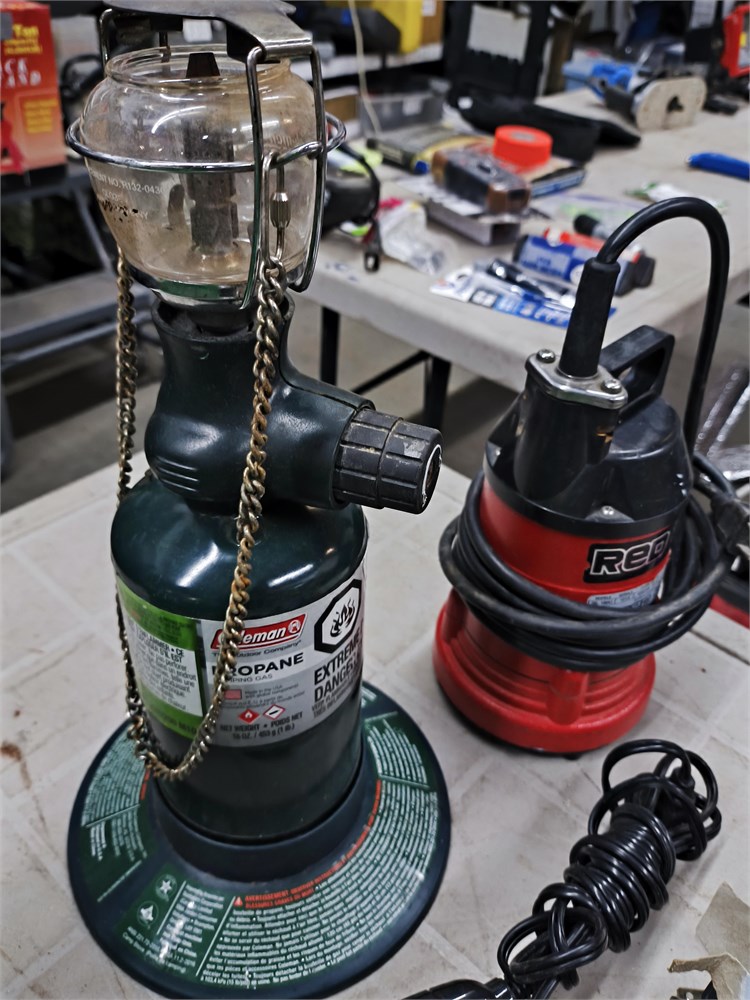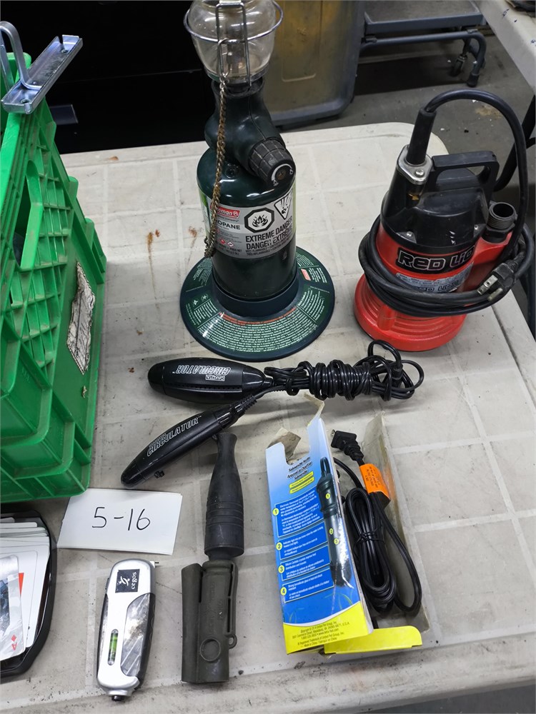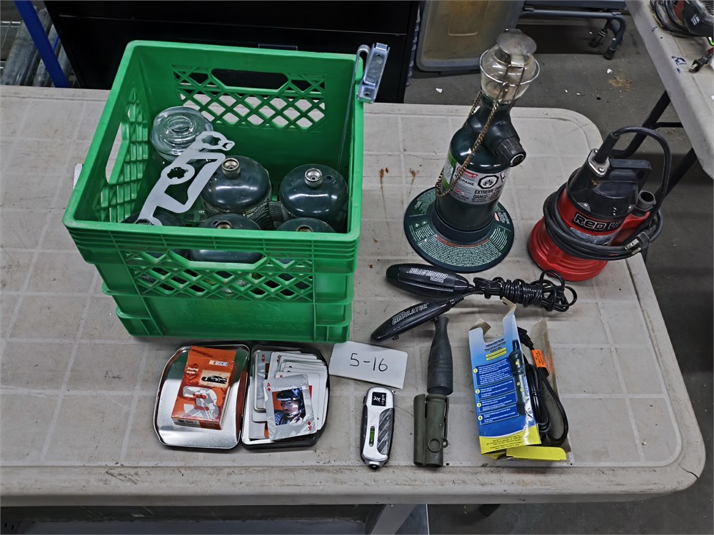 (6) bottles of propane, Propane Lantern, Red Lion submersible pump, Playing cards