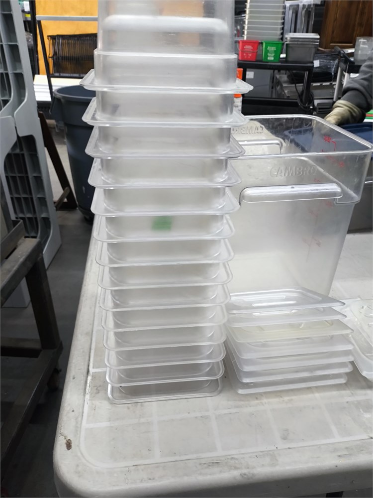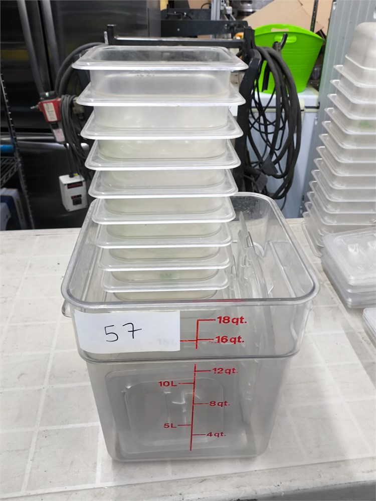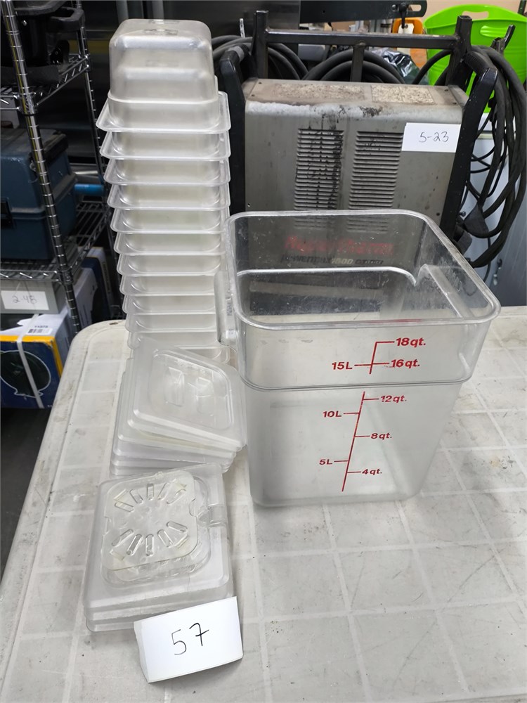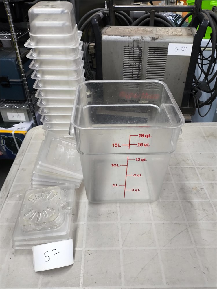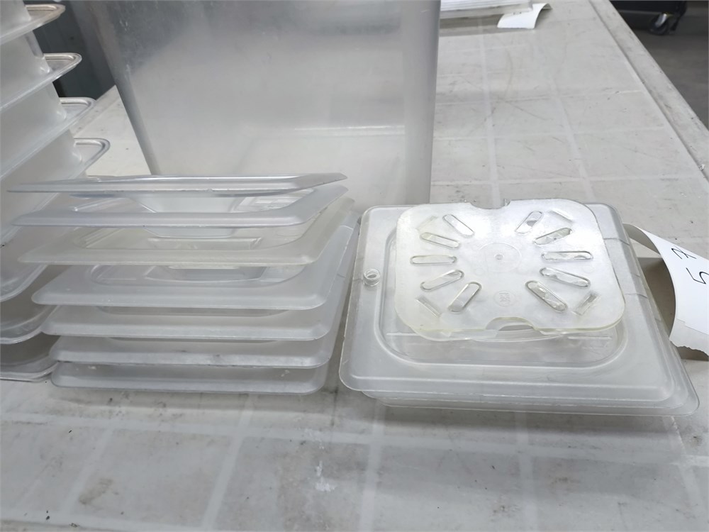 (1) 18 Qt Plastic Square Container with (14) 1/3 Plastic Shallow Food Serving Pans, Lids, and Drain Floor