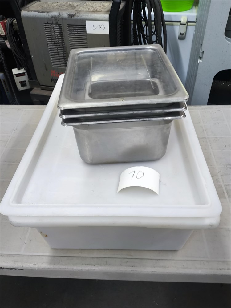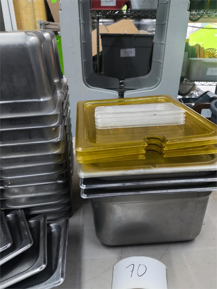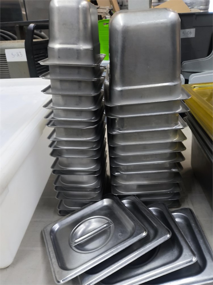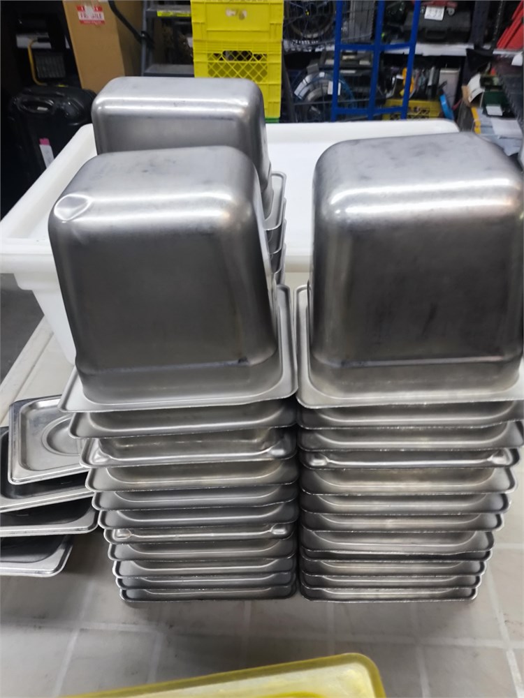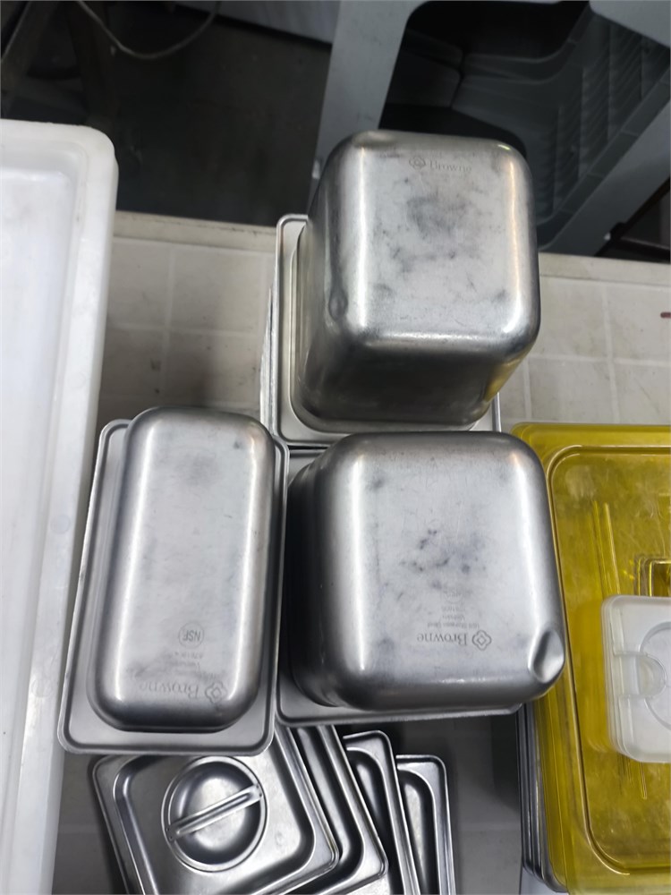 (11) 1/3 Metal Deep Food Storage Containers with Lids, (16) 1/8 Metal Deep Food Storage Containers, (3) 1/2 Metal Deep Food Storage Containers