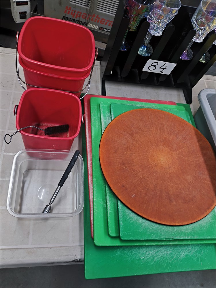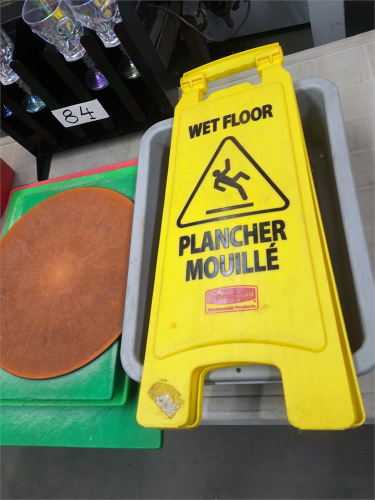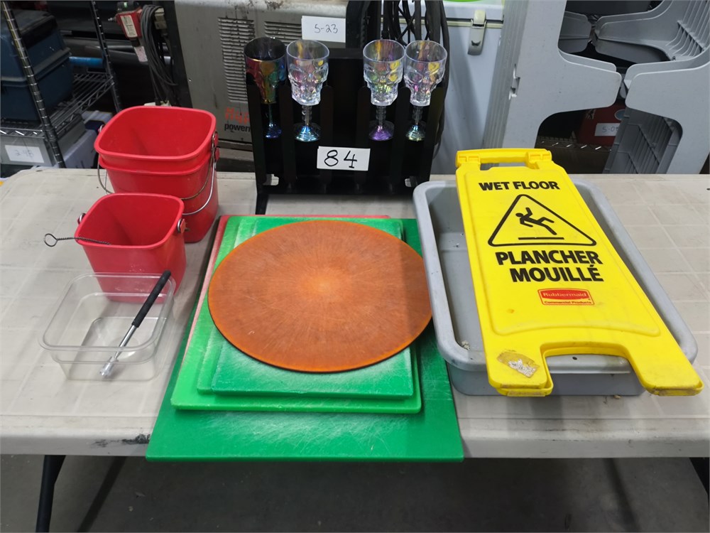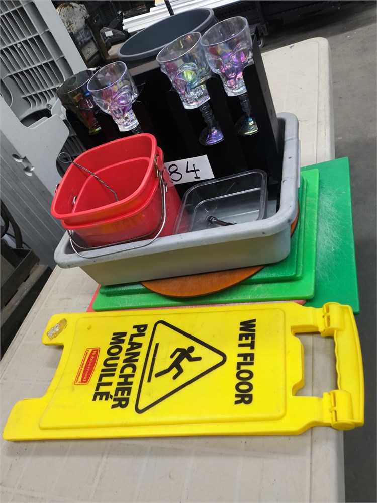 Wet Floor sign, (5) Cutting Boards, Sterilizer Pail, Skull Cups, Dipping Sauce Holder