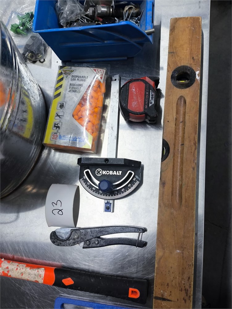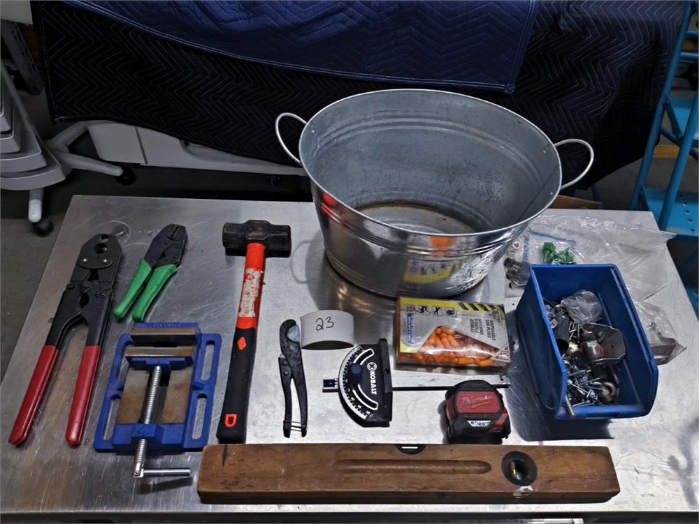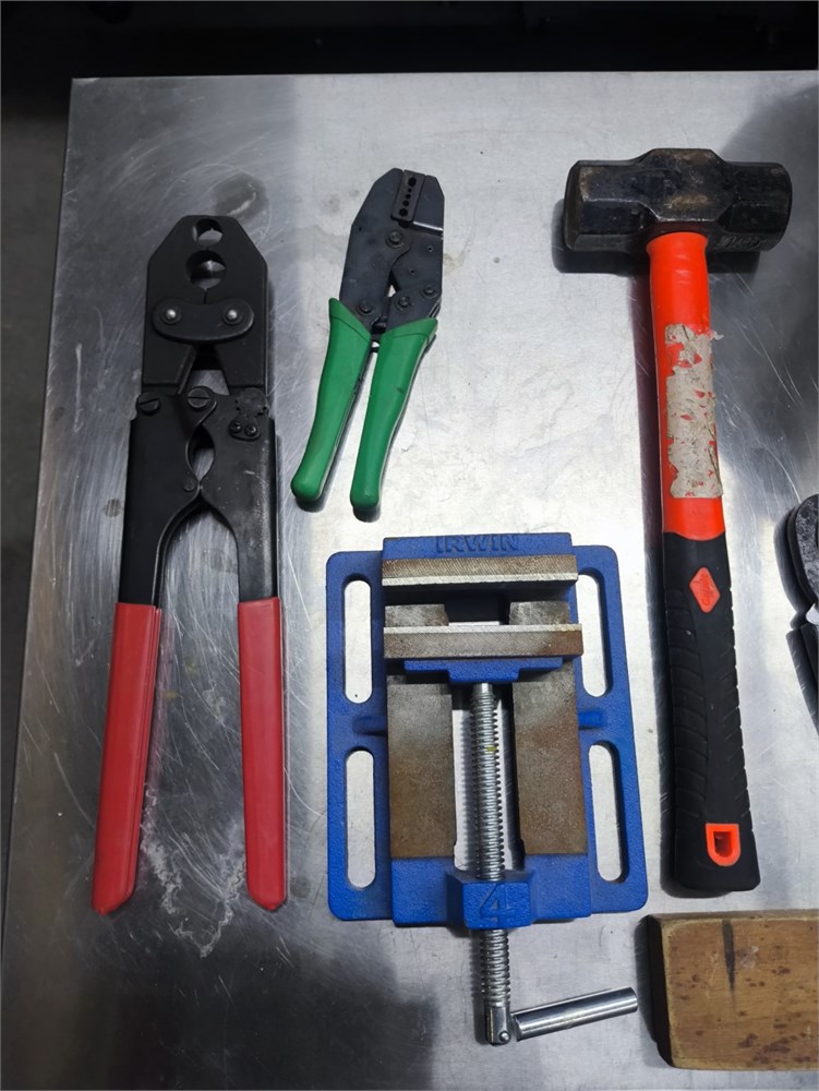 Hammer, Pipe Crimper, Electrical Crimper, Level, and All Pictured Items