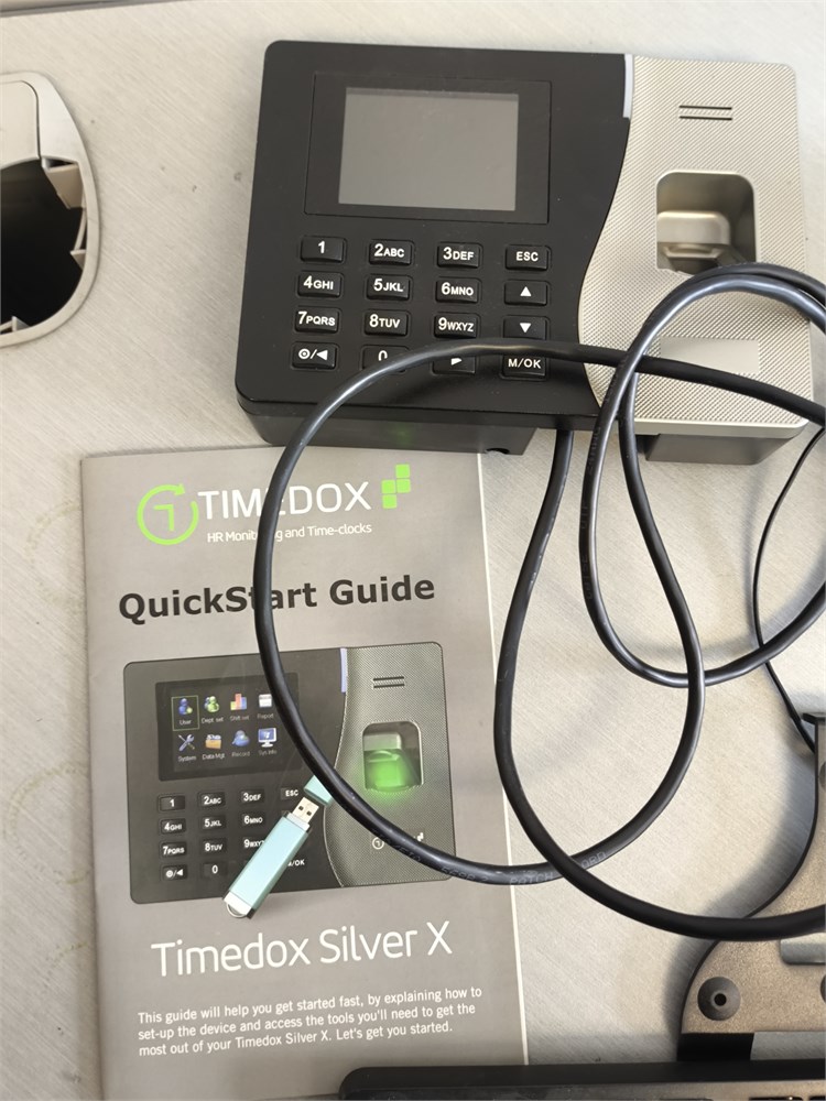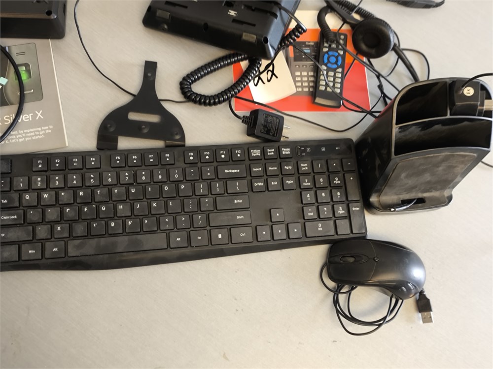 Ooma Phone, Finger Printer Timedox Silver X, Keyboard, and Pictured Items
