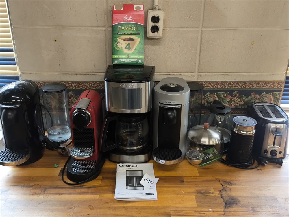 (3) Nespresso Coffee Pod Machines, Cusinark Coffee Maker, Nespresso Bean Grinder, 2 Bay toaster, Tea Kettle
