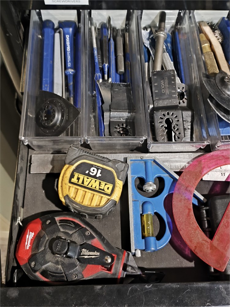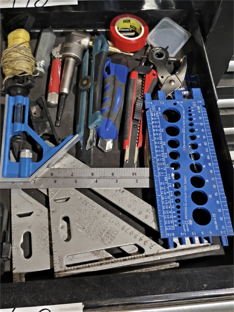 Knives, Squares, Tape Measure, Chaulk Line, Punches, Chisels and all parts within the drawer
