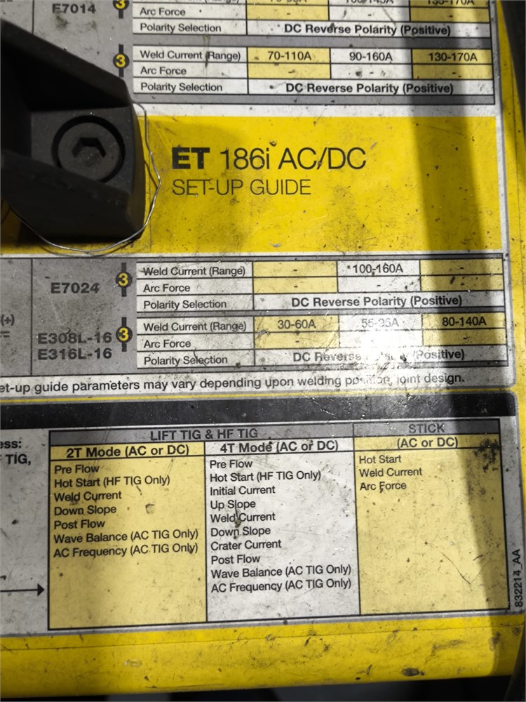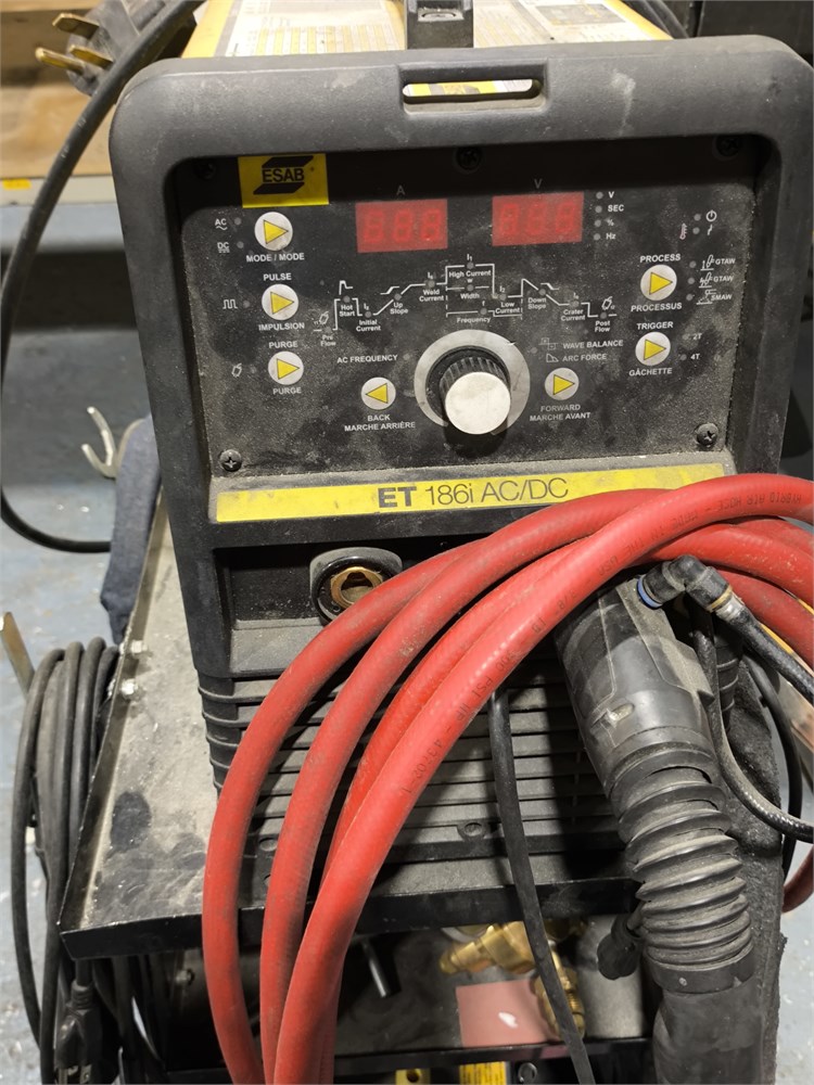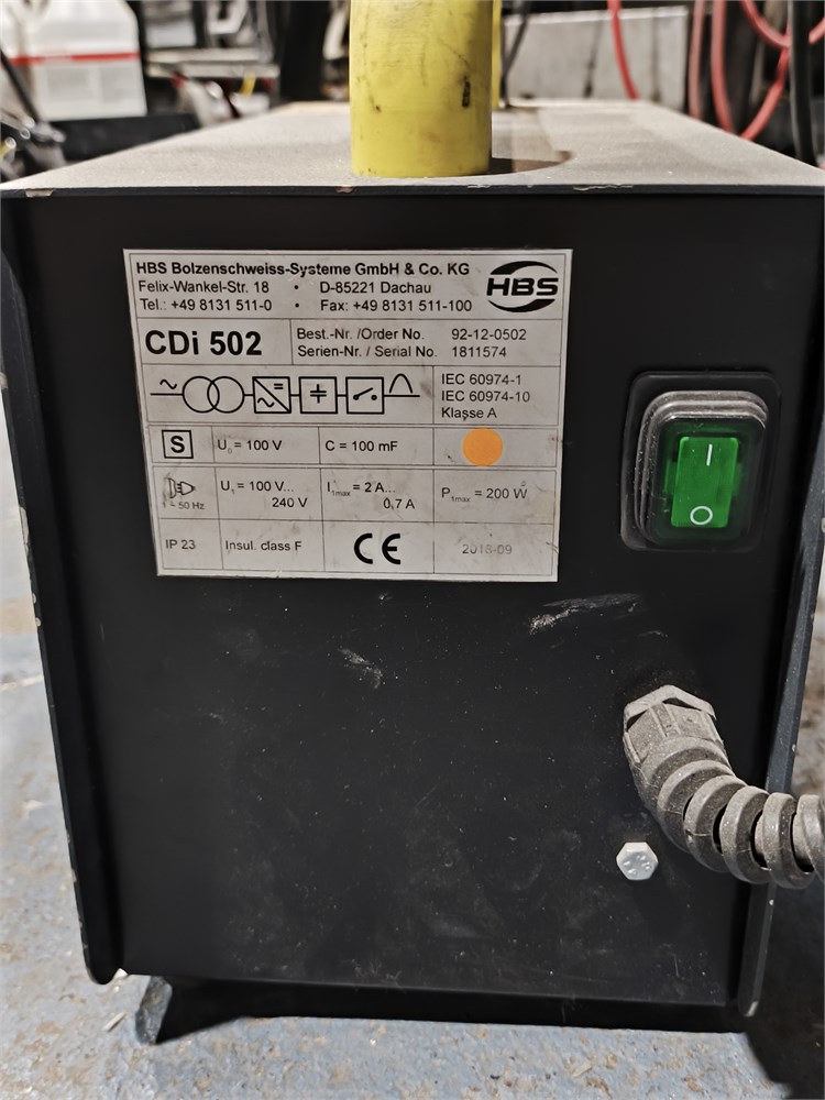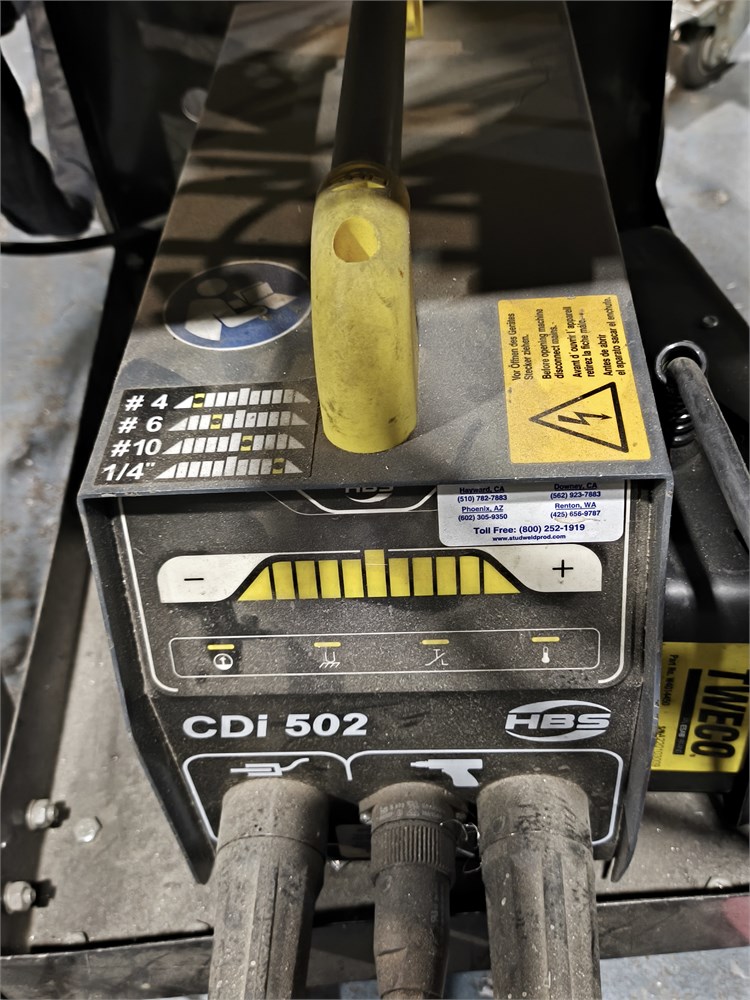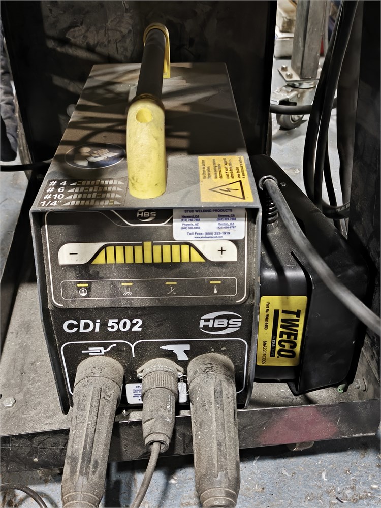 Portable Welding Cart Including: ESAB ET 186i AC/DC TIG/Stick Welding machine and HBS CDi 502 Capacitor Discharge (CD) stud welding machine and other. See pictures. Not Tested.