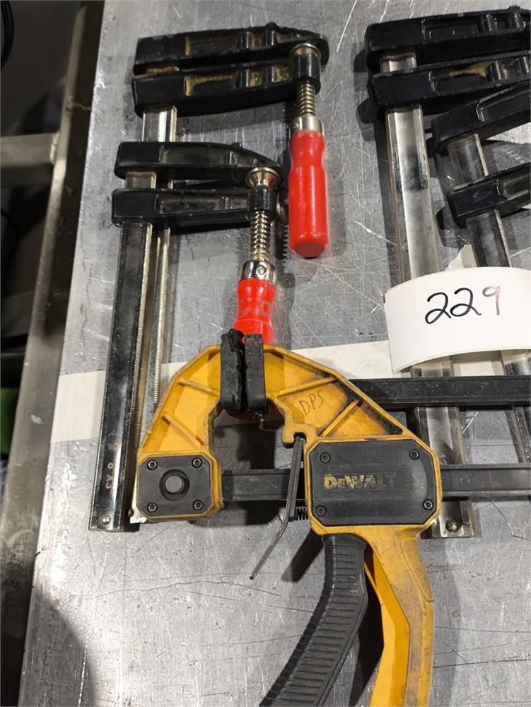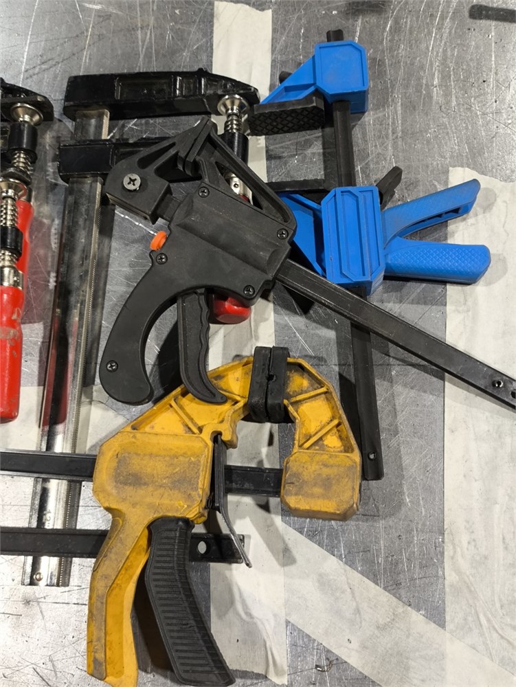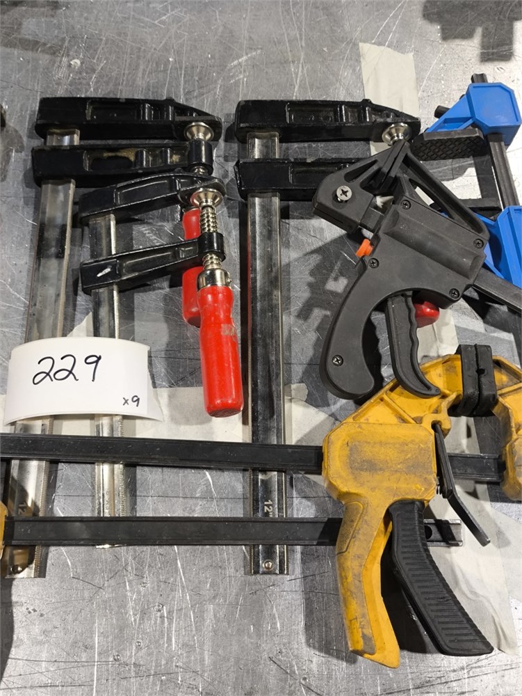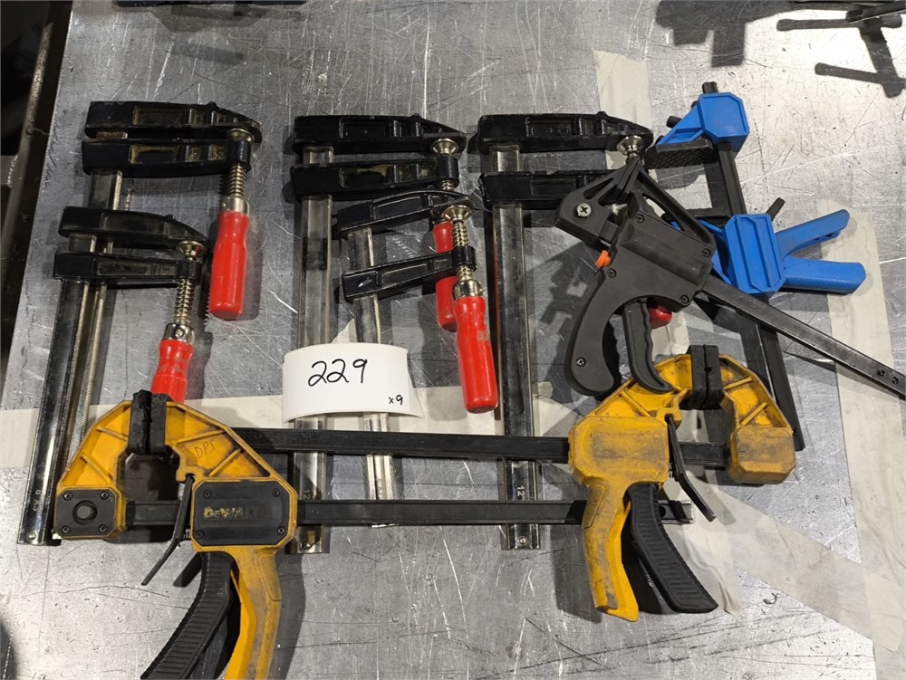 (9) Various Bar Clamps including F-style bar clamps, C-clamps and trigger clamps.