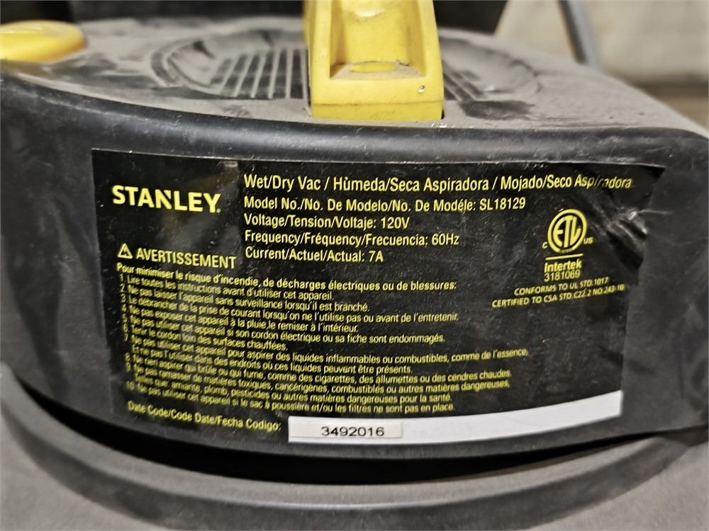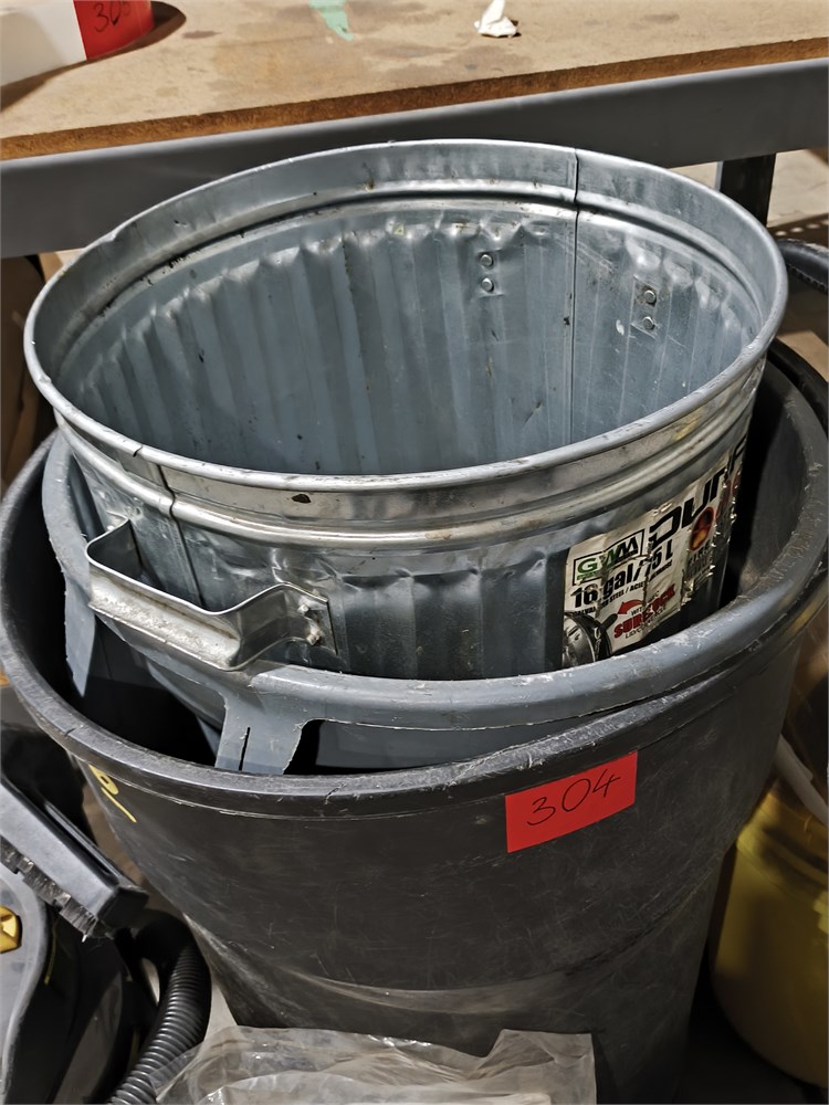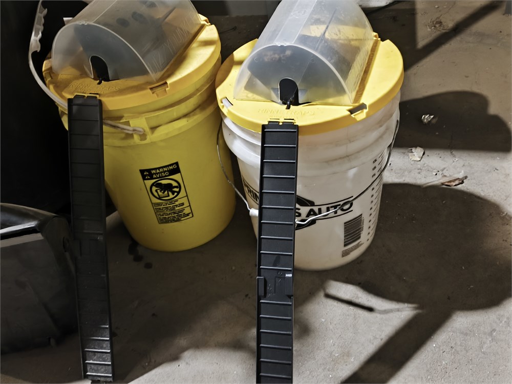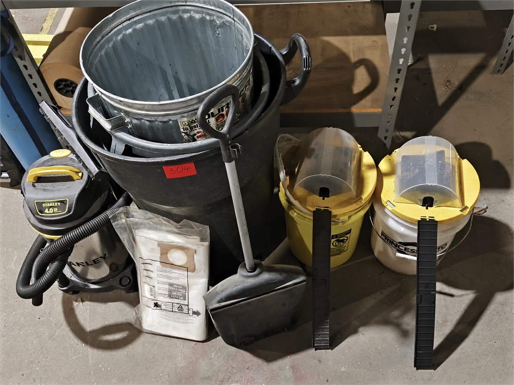 (2) Bucket Mouse Trap, Stanley 4HP Shop Vac, (3) Garbage Bins