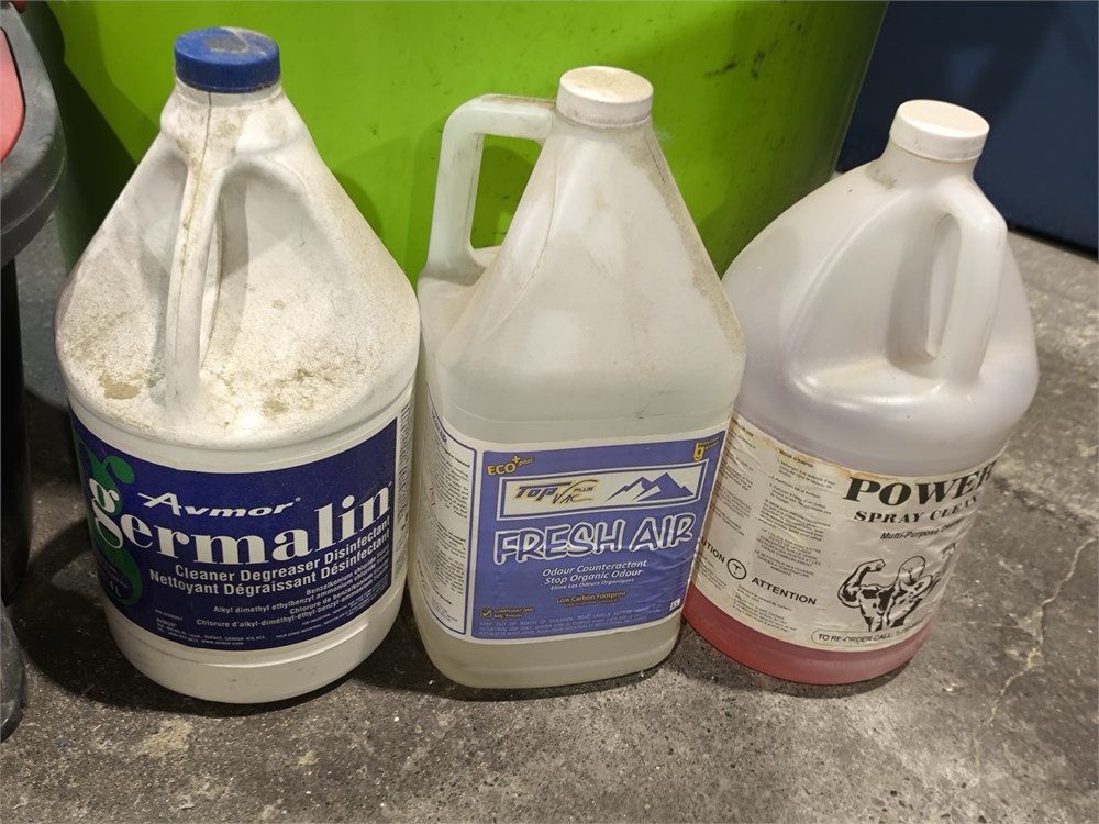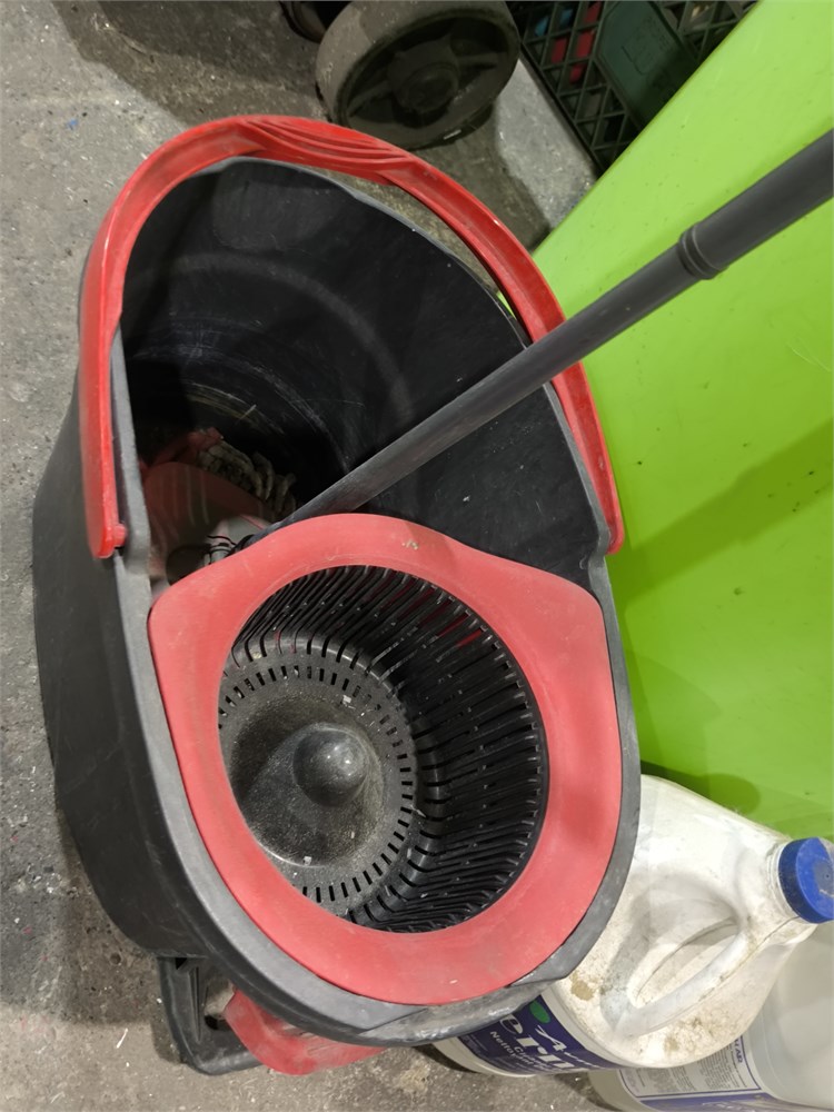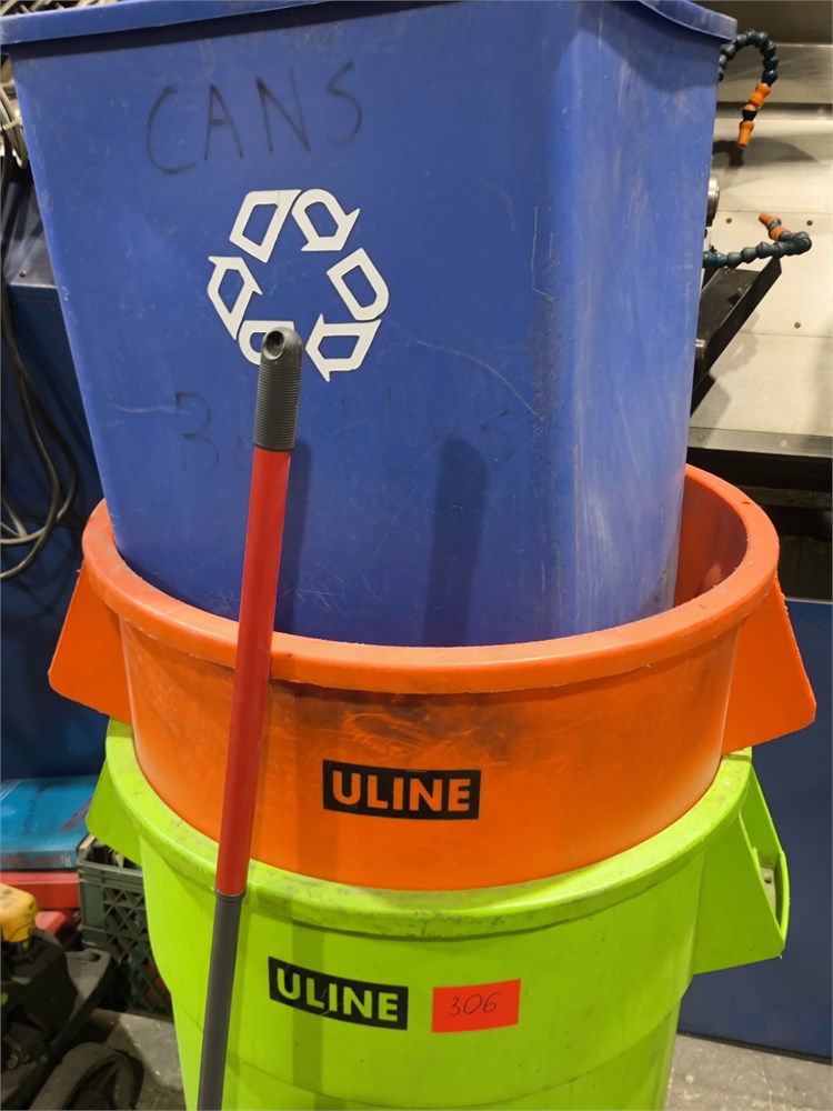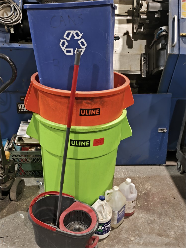 (2) Uline Garbage Cans, Mop and Bucket, Various Cleaners