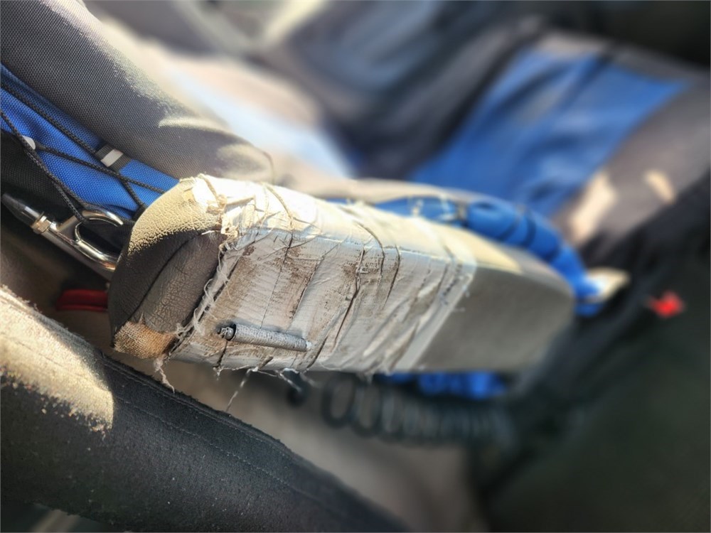 Cloth interior, Driver's seat is worn, the armrest has a cracks, that was covered with duct tape and the passenger's seat has stains
