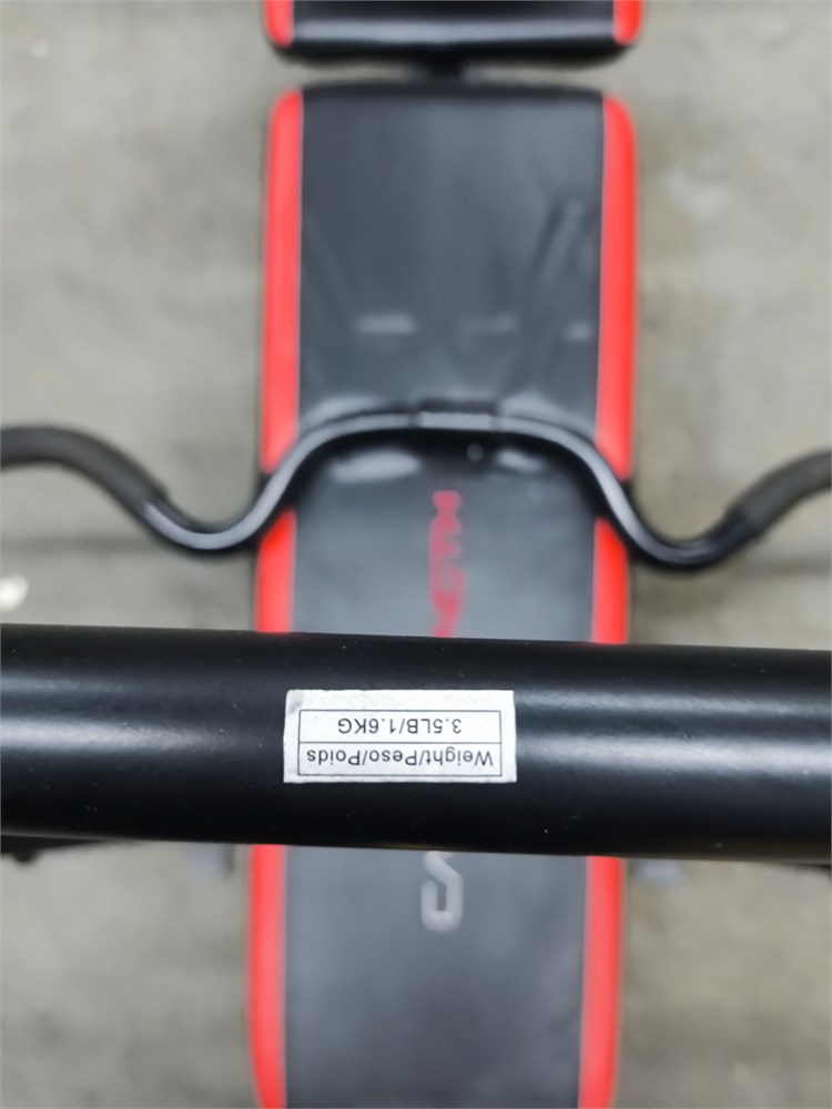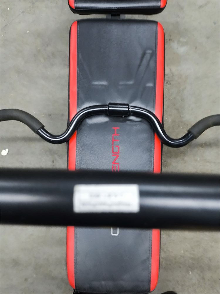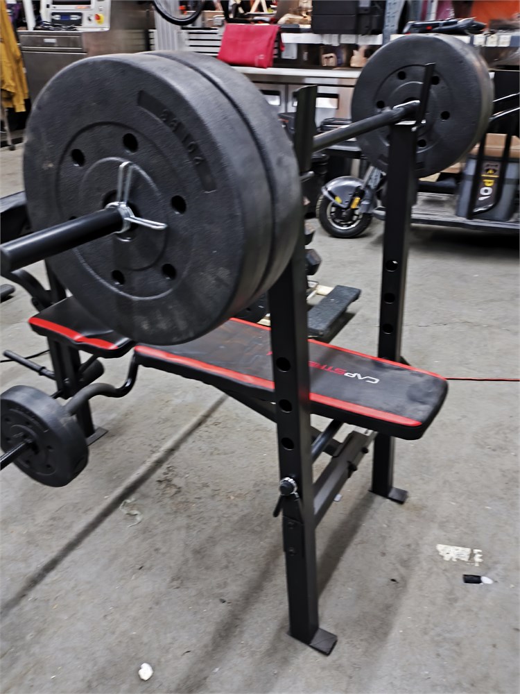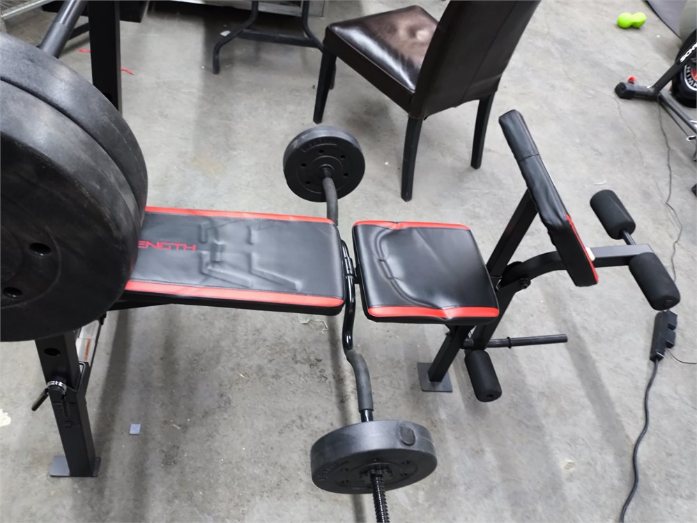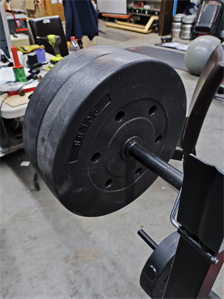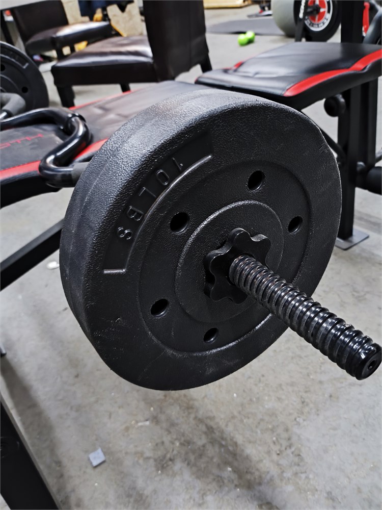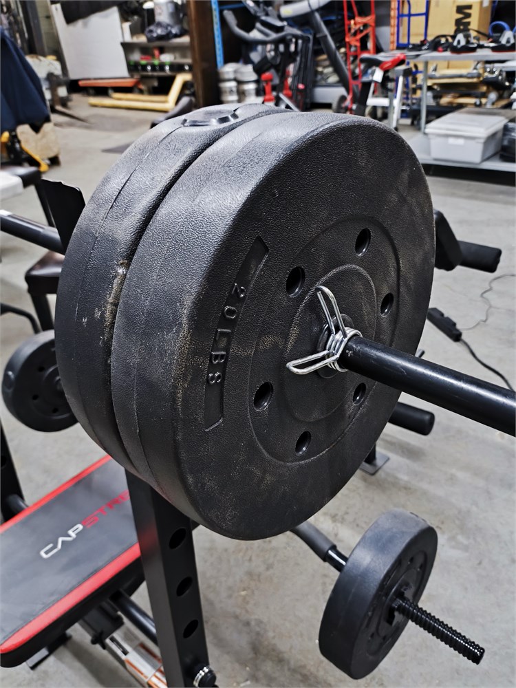 with (4) 20lbs weights, (2) 10lbs weights, (1) 3.5lbs straight bar, (1) 3.5lbs Curl Bar