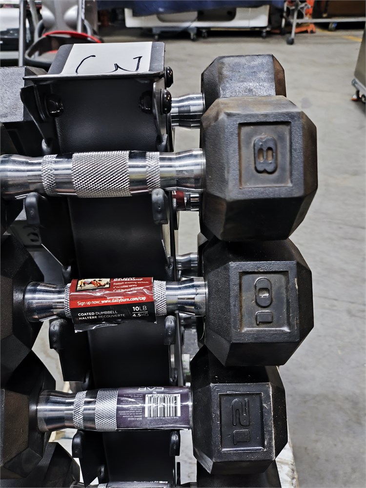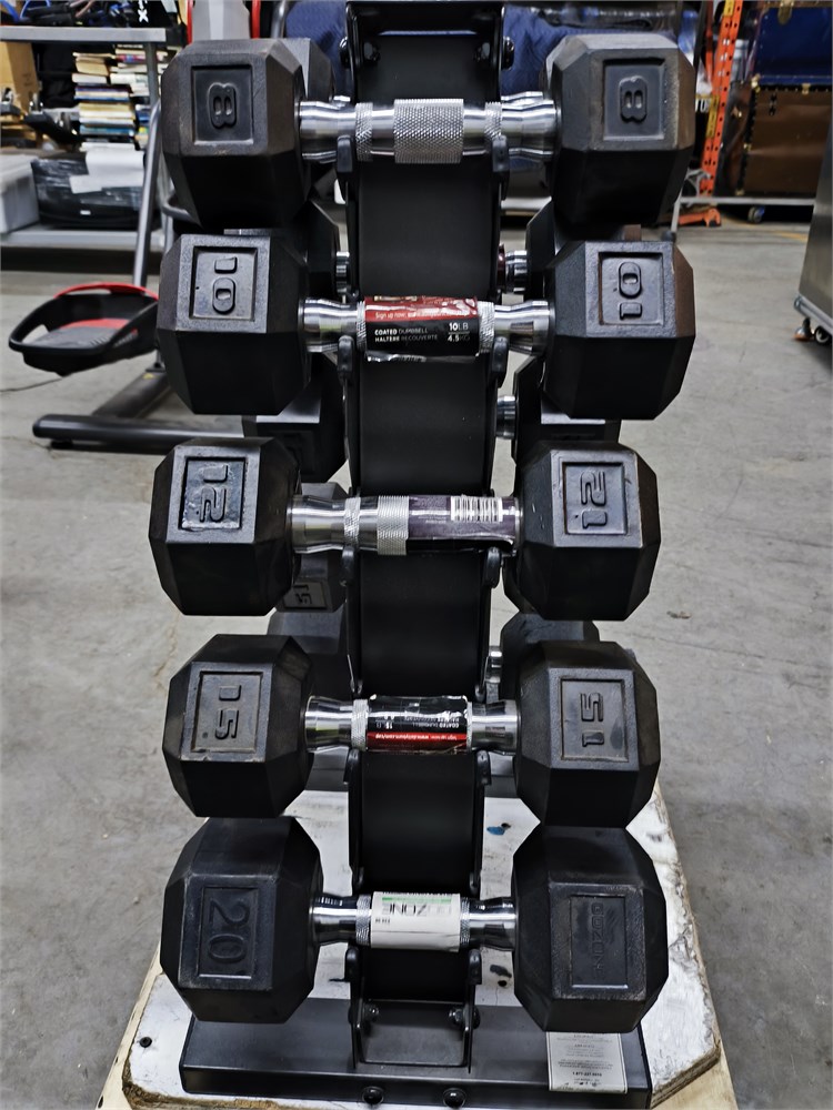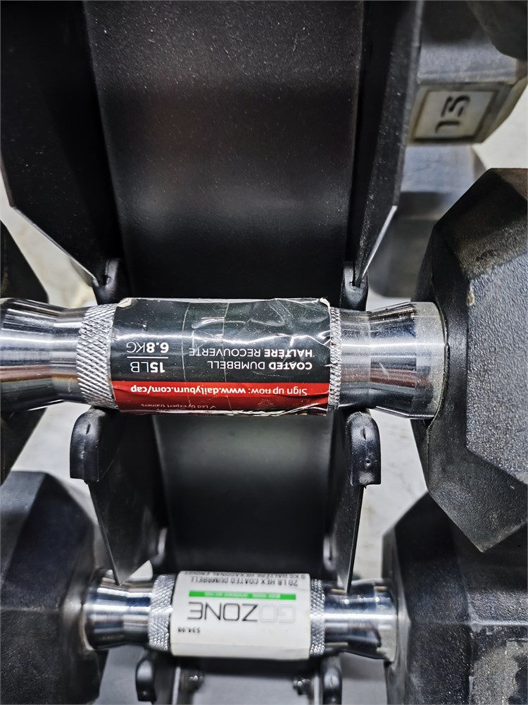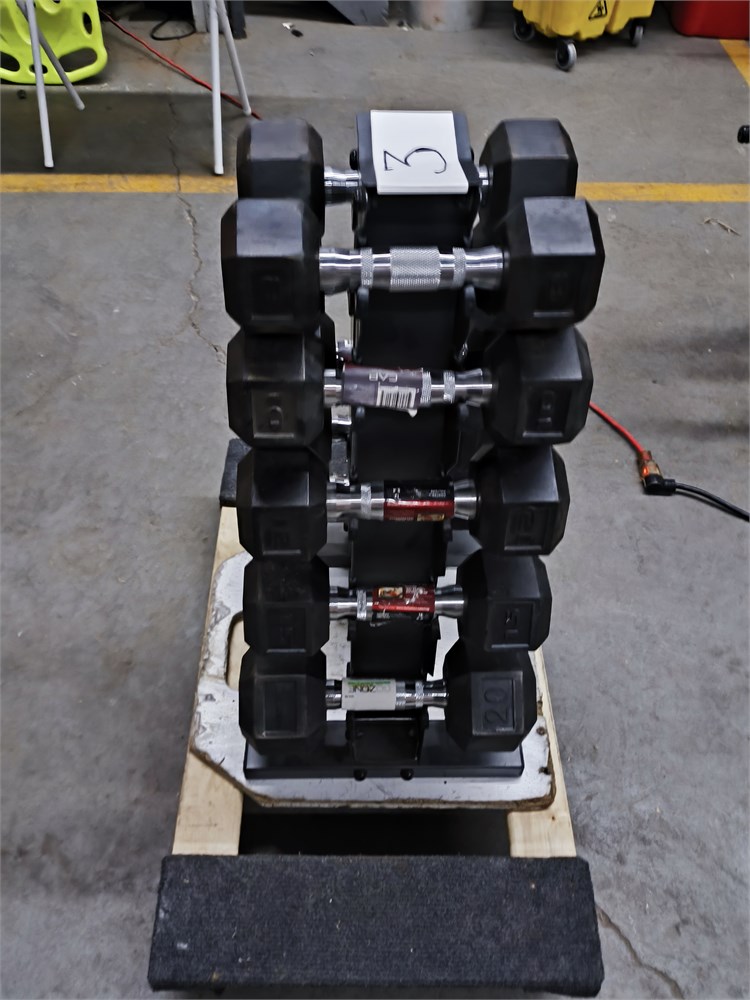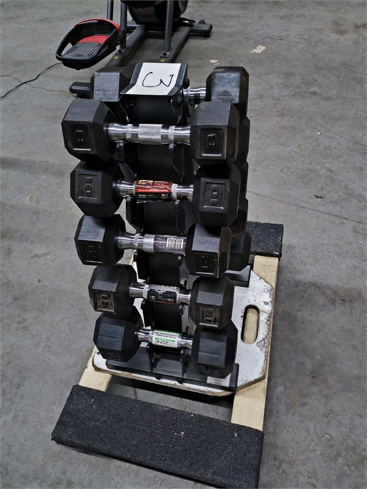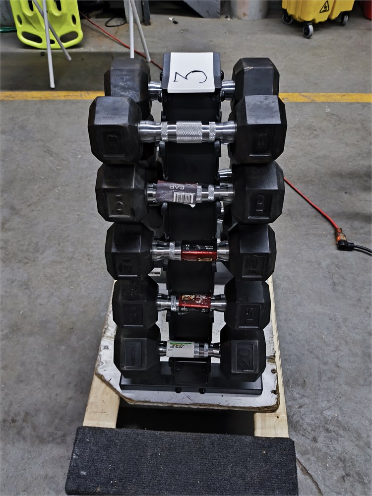(2) 5lbs, (2) 10lbs, (2) 12lbs, (2) 15lbs, (2) 20lbs