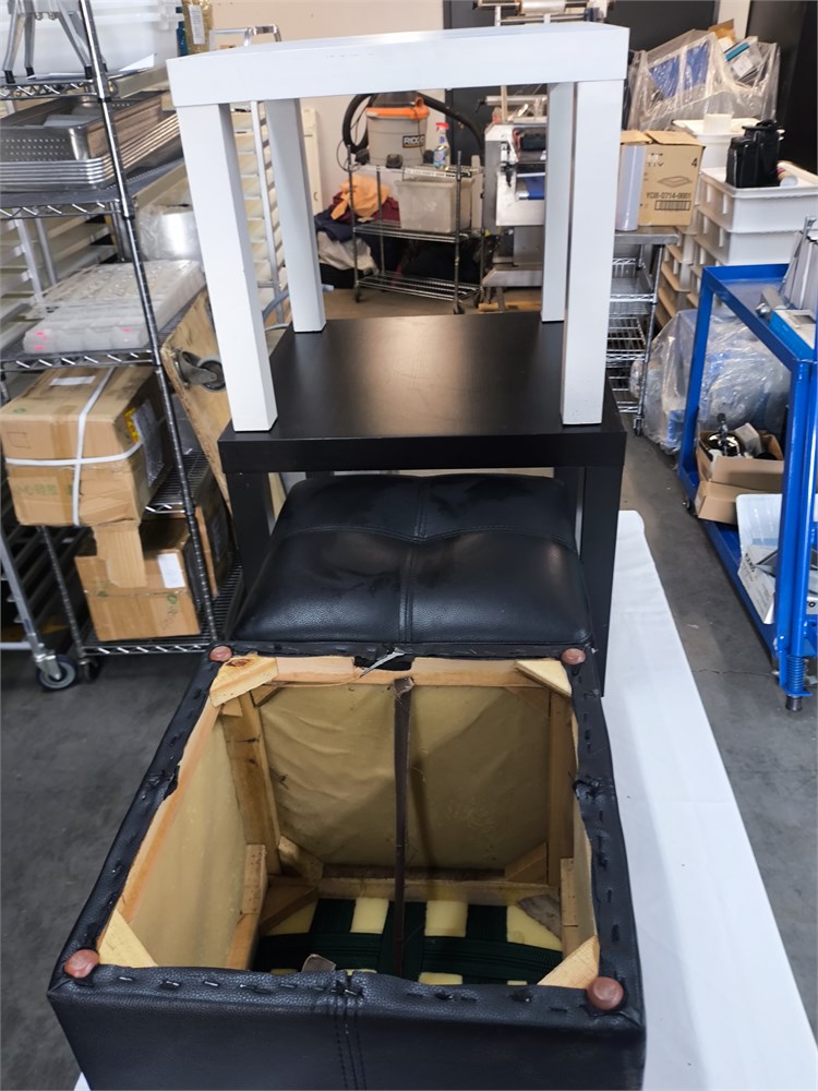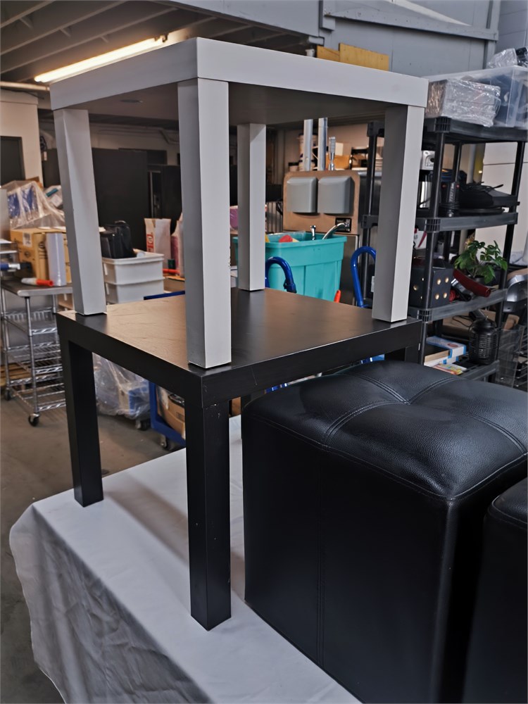 (4) Black Table 18"H x 21" x 21" White Table 17"H x 20" x 20" Ottomans 15"H x 15" x 15"