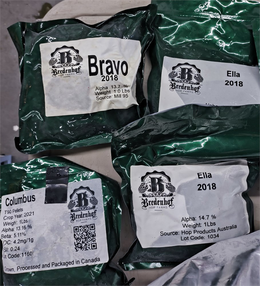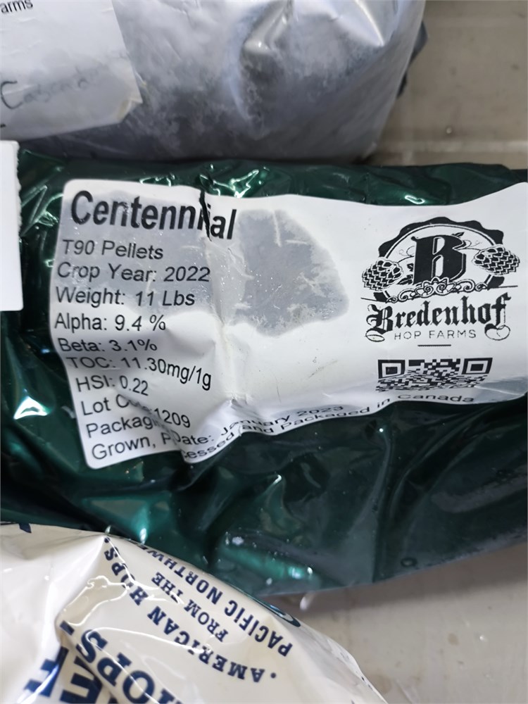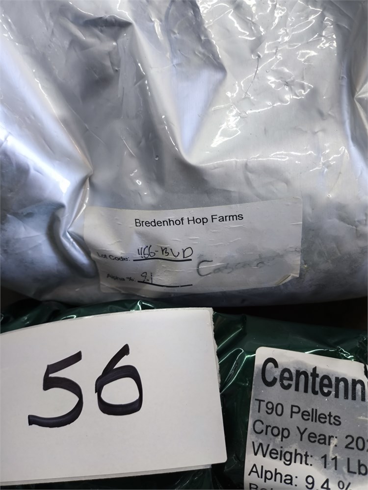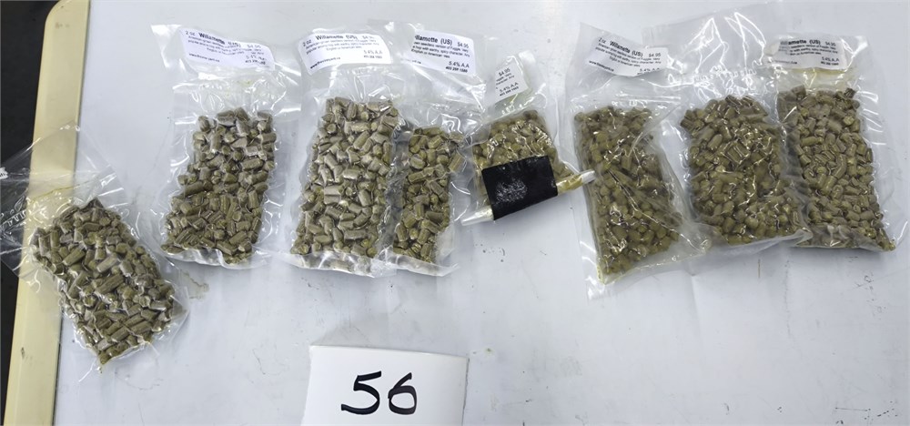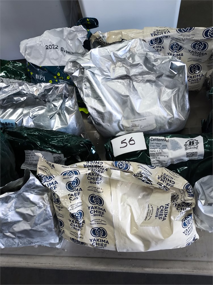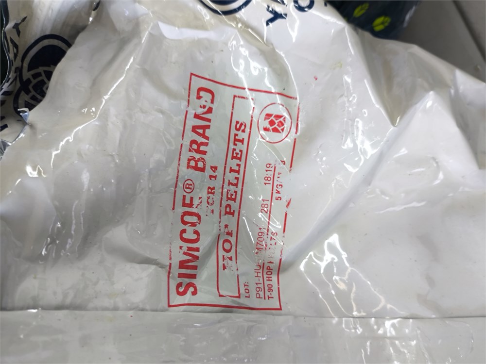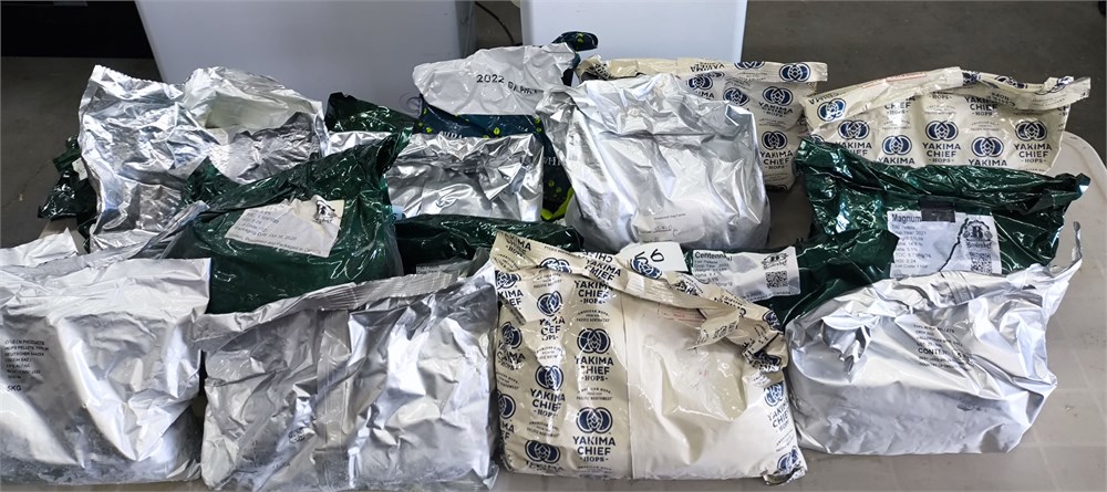 8 sealed bags - Willamette Hop Pellets, Open Bag - Deutscher Saazer Hop Pellets, Open Bag - Mosiac HPC369 Hop Pellets, Open Bag - Magnum Hop Pellets, Open Bag - Hallertauer Hop Pellets, Open Bag - Simcoe YCR Hop Pellets, Open Bag - BC Cascade Hop Pellets, Open Bag - Centennial Hop Pellets, 2 open bags - Columbus Hop Pellets, Open Bag - Galaxy Hop Pellets, Open Bag - Citra Hop Pellets, Open Bag - Cascade Hop Pellets, Sealed Bag - MT Hood Hop Pellets, Open Bag - Nelson Sauvin Hop Pellets, Open Bag - Perle Hop Pellets, Sealed Bag - Bravo Hop Pellets, 2 Sealed Bags - Ella Hop Pellets, 2 Sealed Bags - Azacca Hop Pellets.