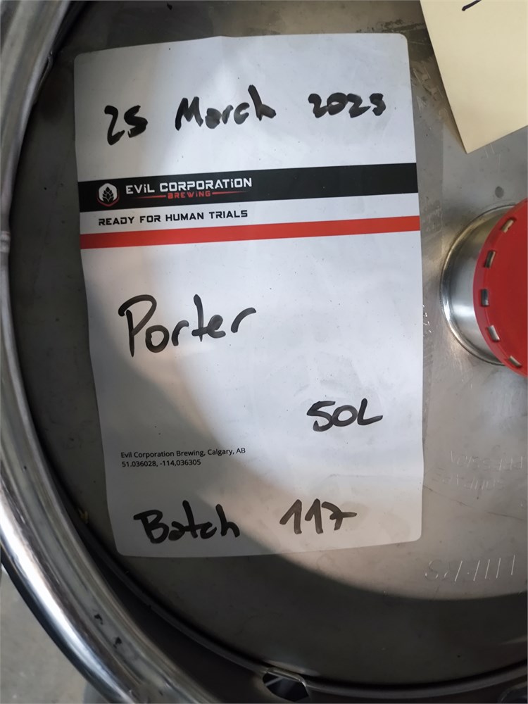 50L Keg with Contents labeled as "Evil Corporation Brewing Porter" see tag for more details
