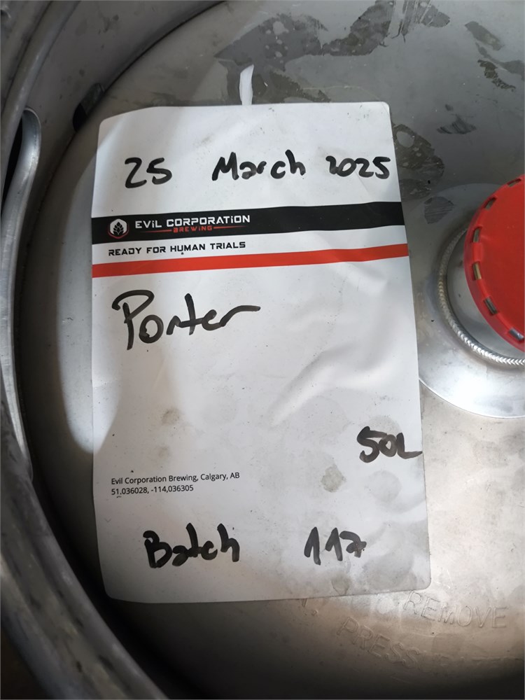 50L Keg with Contents labeled as "Evil Corporation Brewing Porter" see tag for more details