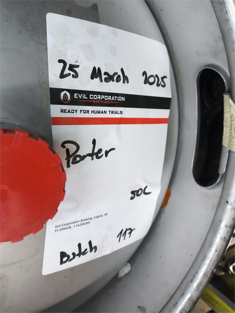 50L Keg with Contents labeled as "Evil Corporation Brewing Porter" see tag for more details