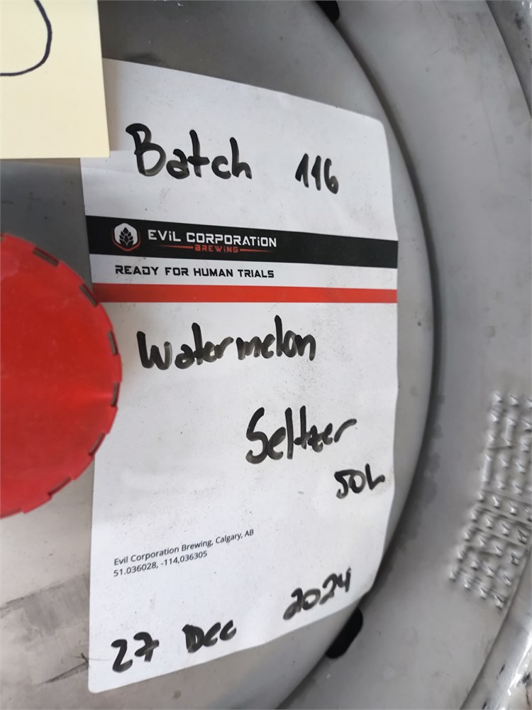 50L Keg with Contents labeled as "Evil Corporation Brewing Watermelon Seltzer" see tag for more details