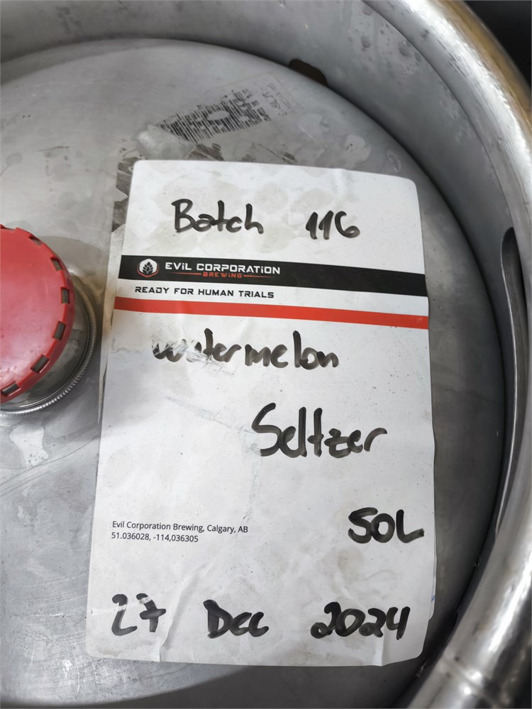 50L Keg with Contents labeled as "Evil Corporation Brewing Watermelon Seltzer" see tag for more details