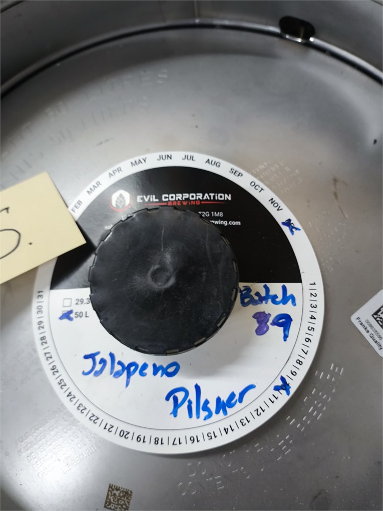 50L Keg with Contents labeled as "Evil Corporation Brewing Jalapeno Pilsner" see tag for more details