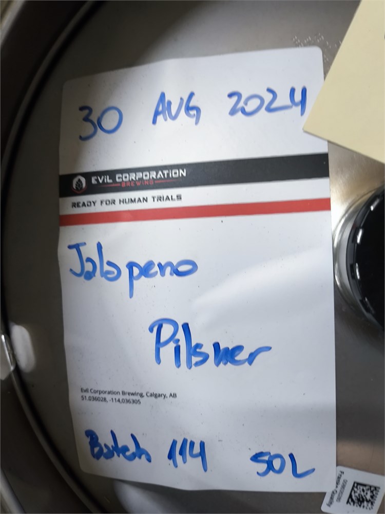 50L Keg with Contents labeled as "Evil Corporation Brewing Jalapeno Pilsner" see tag for more details