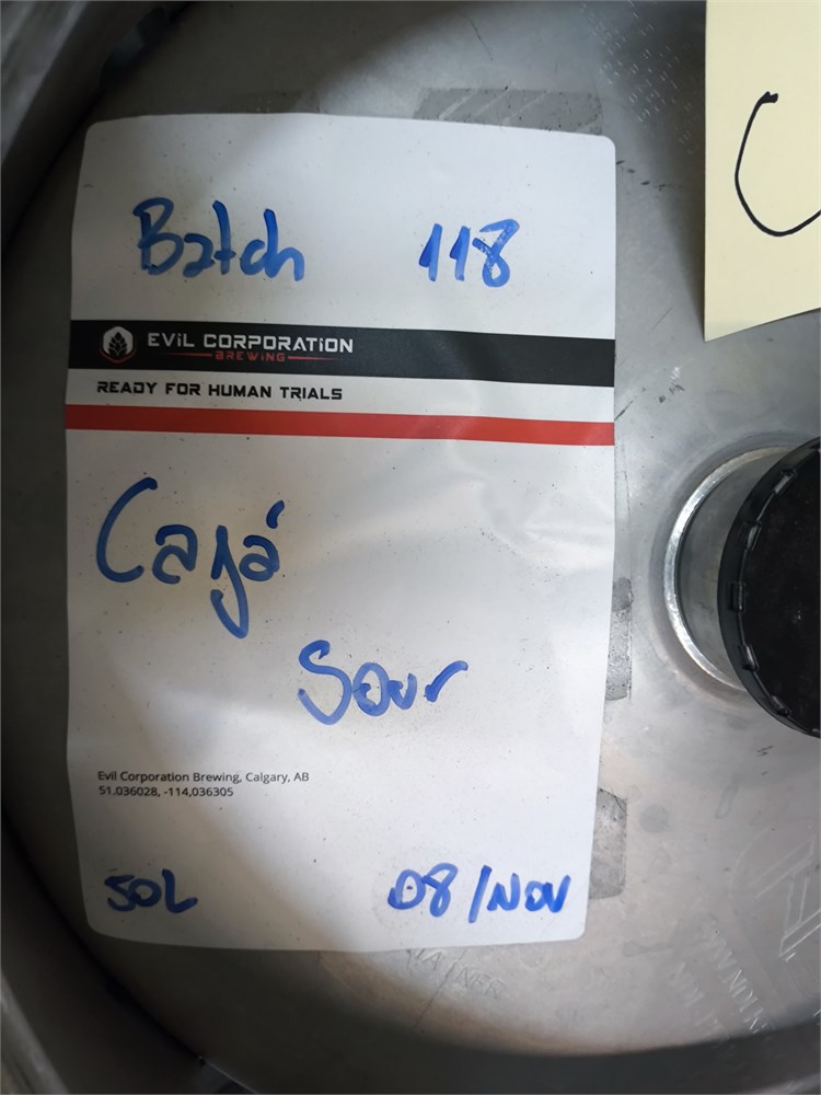 50L Keg with Contents labeled as "Evil Corporation Brewing Caga Sour" see tag for more details