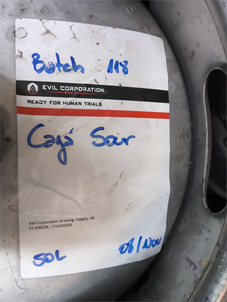 50L Keg with Contents labeled as "Evil Corporation Brewing Caga Sour" see tag for more details