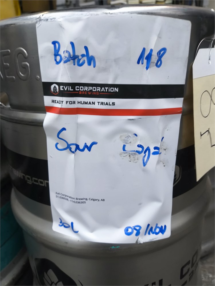 30L Keg with Contents labeled as ""Evil Corporation Brewing Sour Caga" see tag for more details
