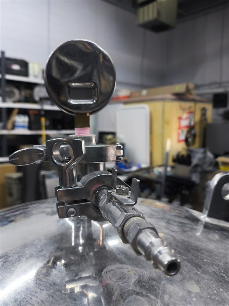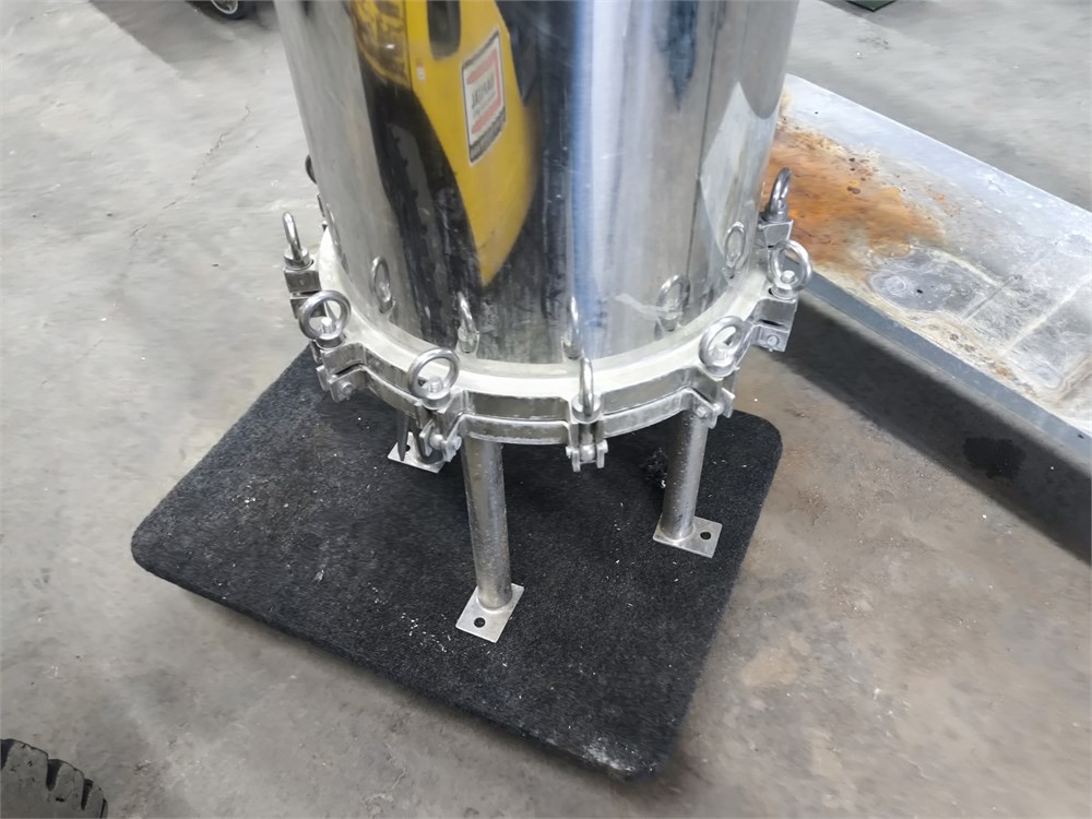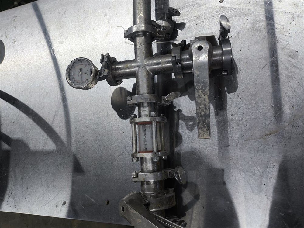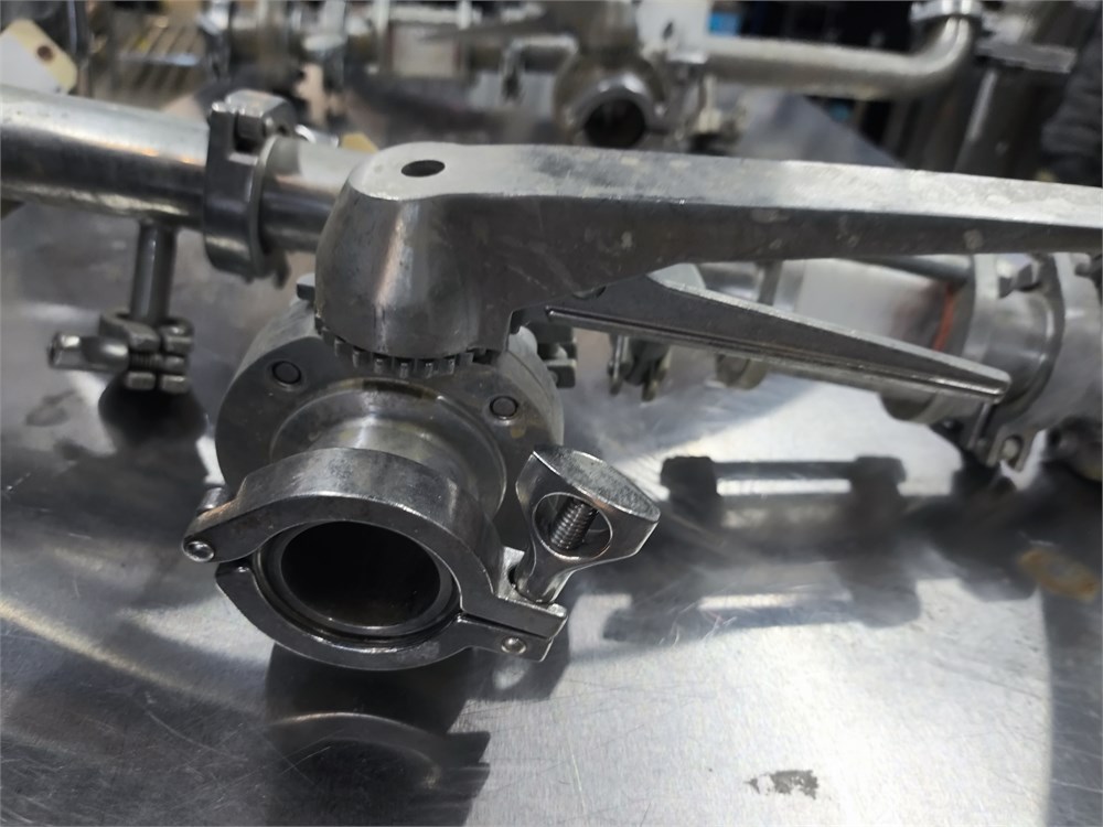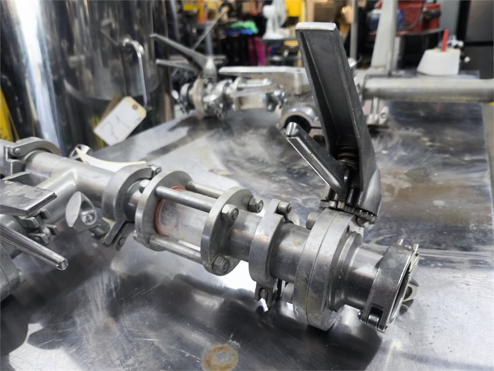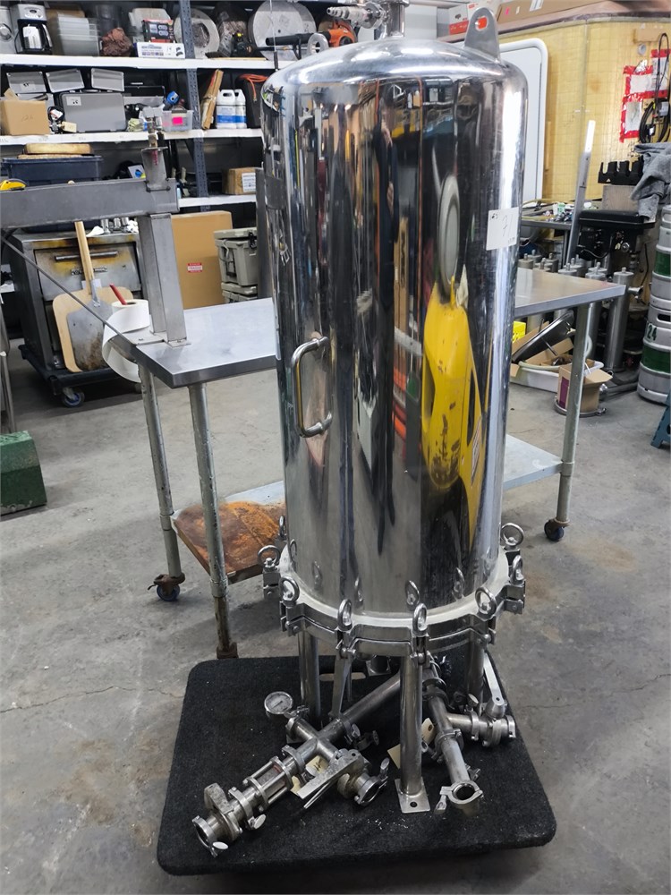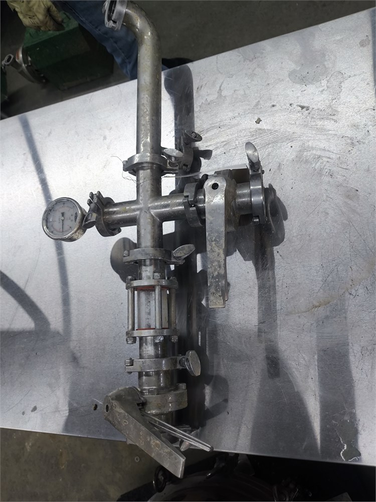 Stainless Steel Filtering tank with Bottom swing bolts, and (2) Stainless Steel Pipes with flow glass and butterfly valves
