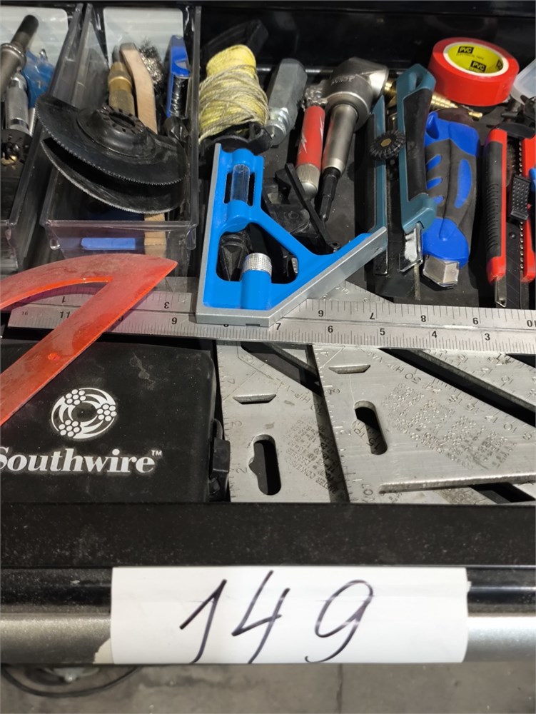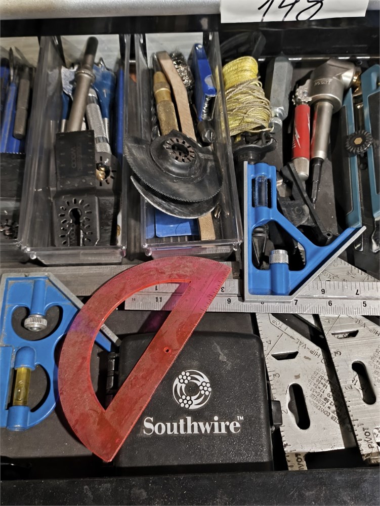 Knives, Squares, Tape Measure, Chaulk Line, Punches, Chisels and all parts within the drawer