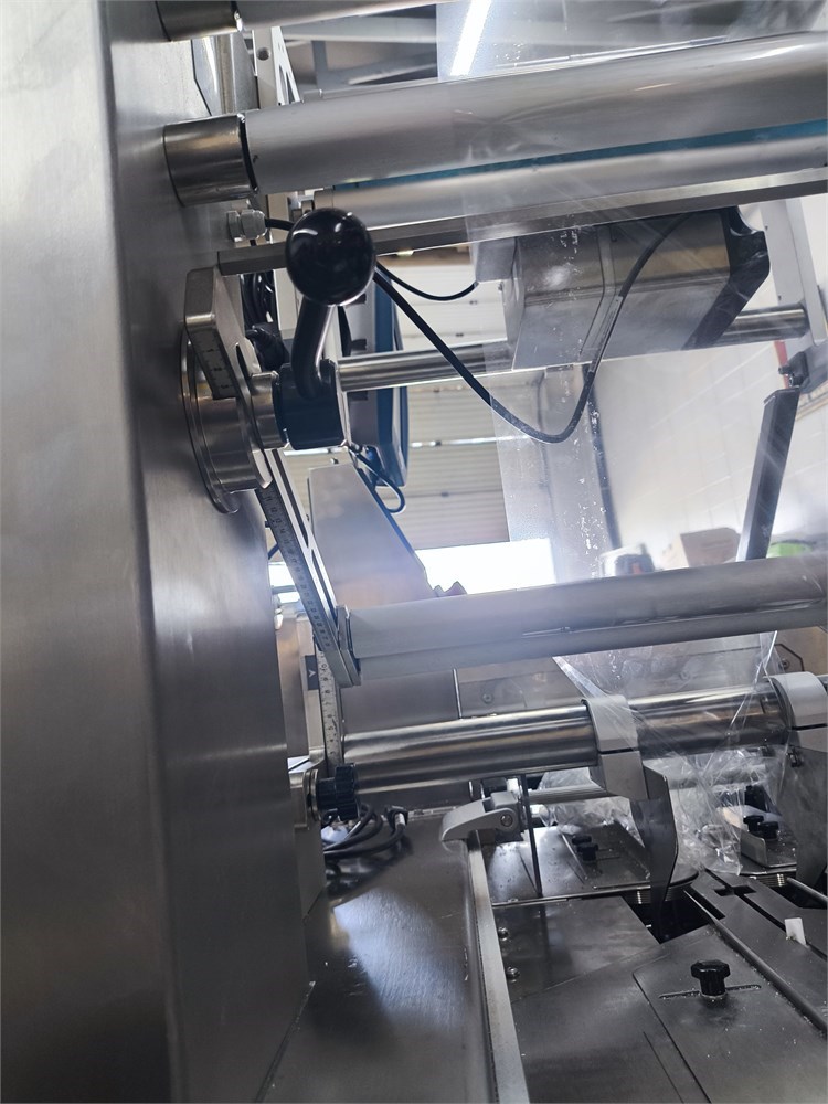 This machine comes standard with stainless steel frame construction, user-friendly color touchscreen, automatic open/close rotary fin wheel assembly, rotary seal jaws with jam detecting logic and the ability to preprogram and store product settings.